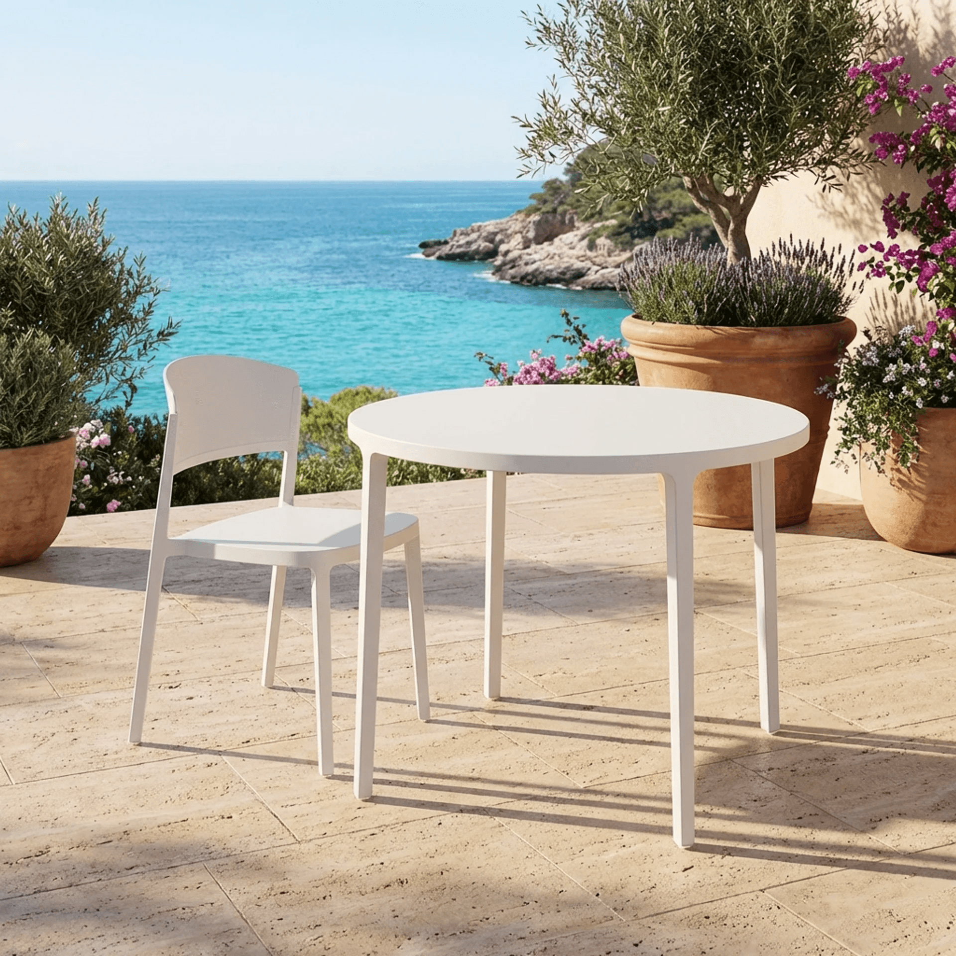 Silla de 4 patas elaborada en tecnopolímero para uso interno y externo apilable colores: blanco, rojo, negro, arena azul pastel y verde olivo.