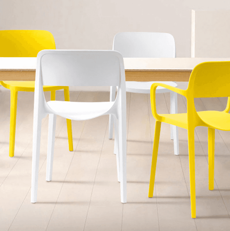 Patas, asiento y respaldo: de una sola pieza en polipropileno de alta resistencia y duración. color: amarillo, aqua o gris. resistencia: peso sugerido 130 kgs.