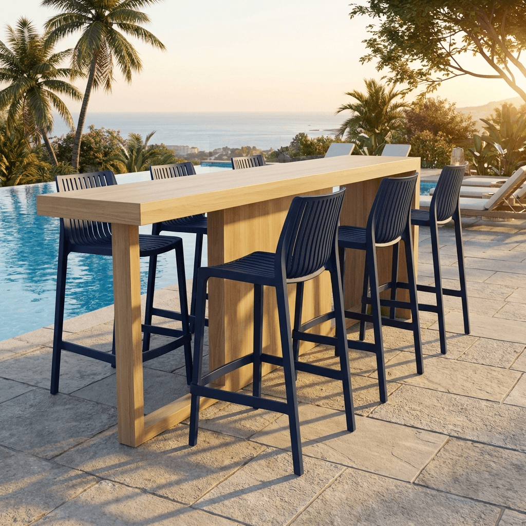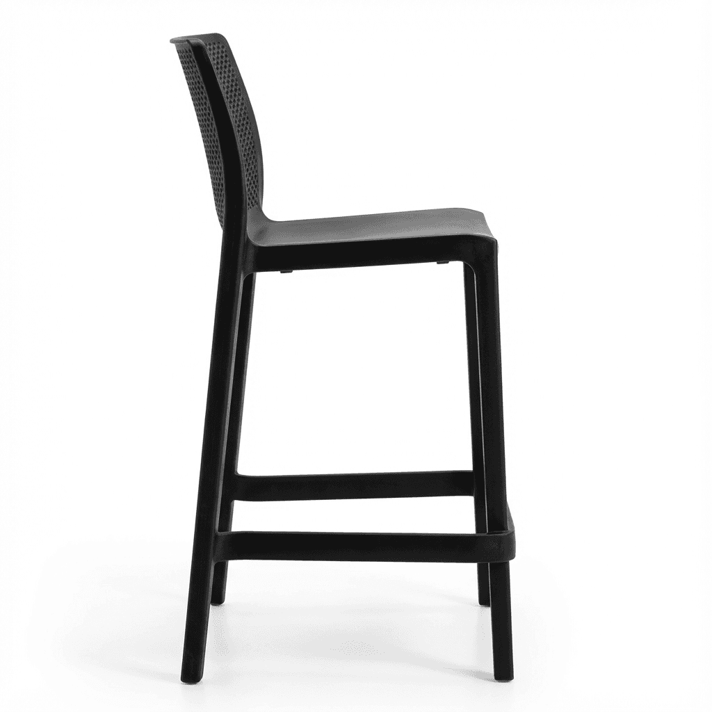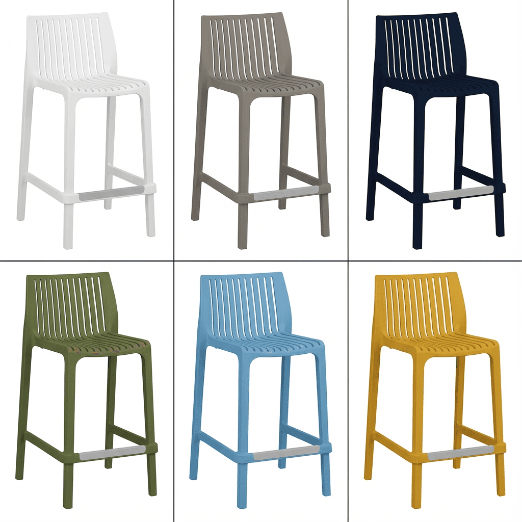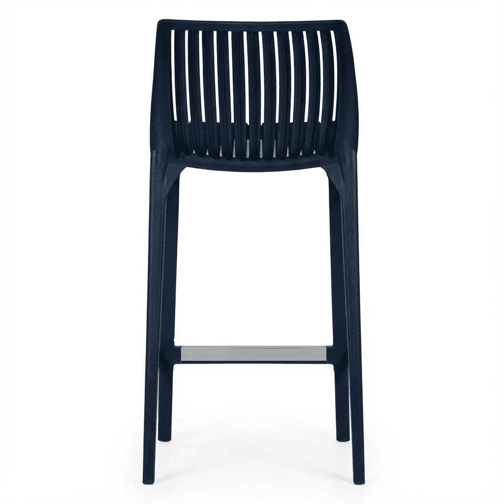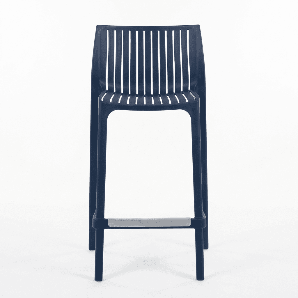 Banco de mostrador para exterior de la línea Milos, fabricado en polipropileno resistente a rayos UV y ambientes salinos, pensado para uso intenso en cafeterías, restaurantes y terrazas. Su diseño moderno, ligero y de fácil mantenimiento lo hace adecuado para espacios de alto tráfico que requieren mobiliario durable y apilable.