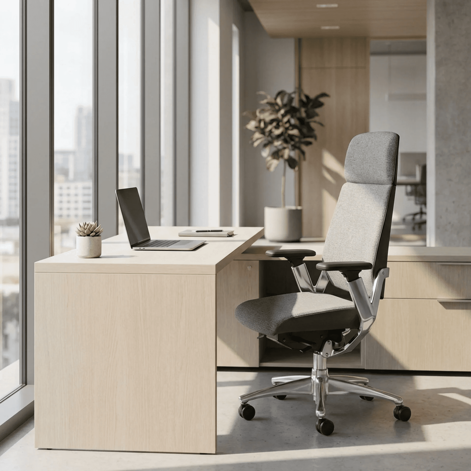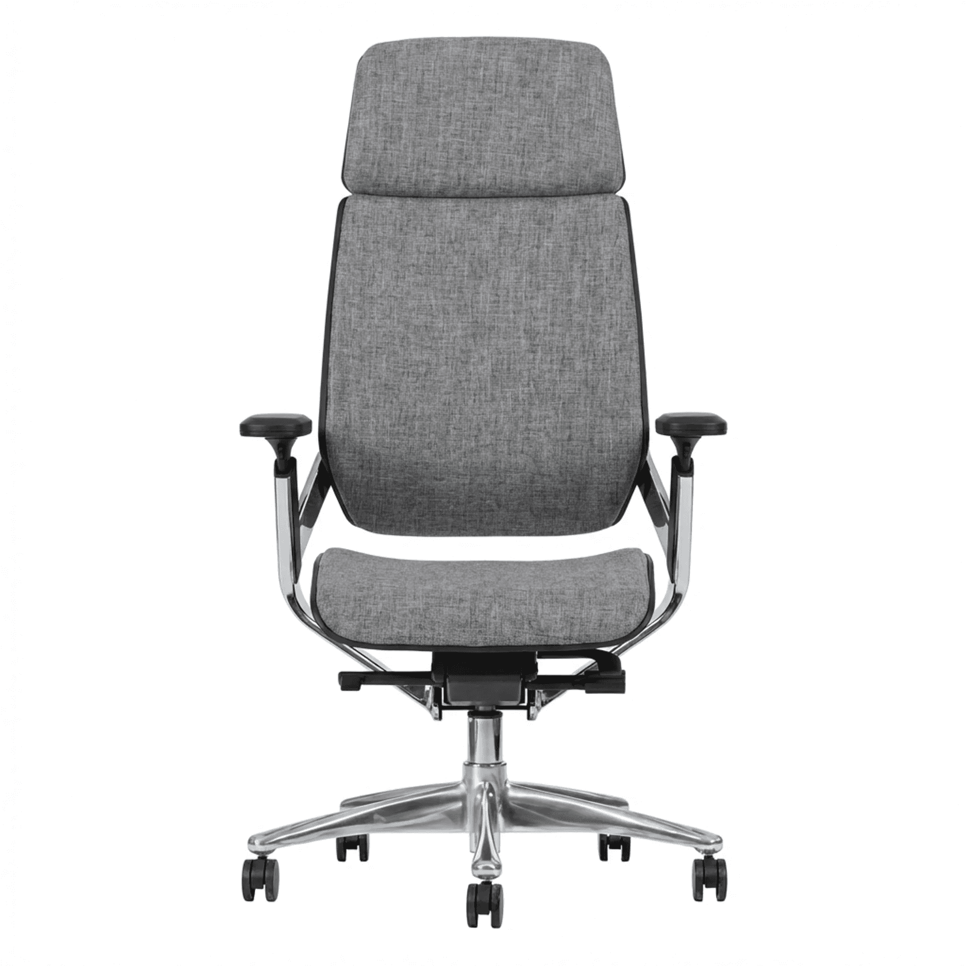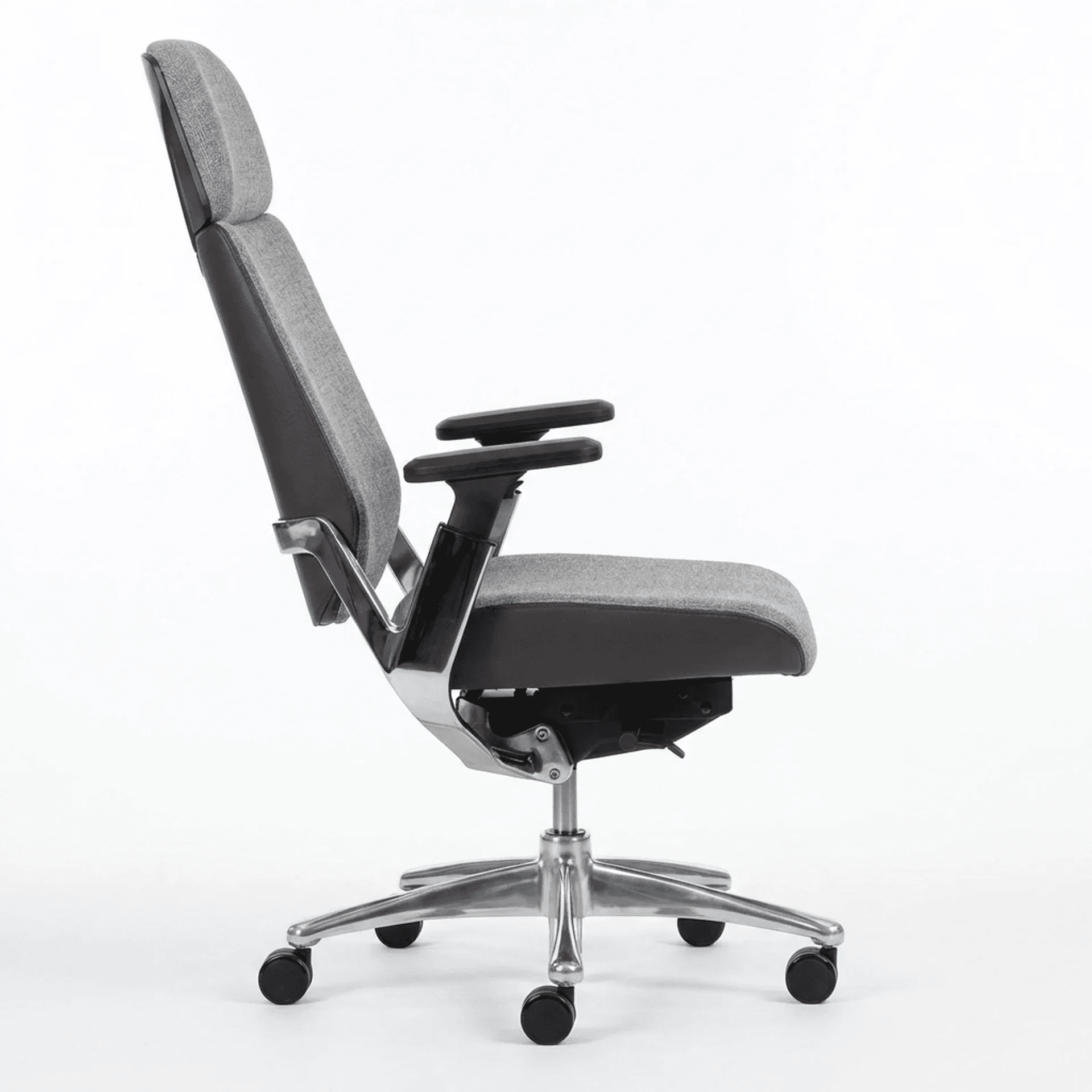 Silla tapizada en piel con mecanismos Synchro multiposiciones de alta calidad, con descansabrazos 3D ajustables, cabecera integrada y base de cinco puntas.