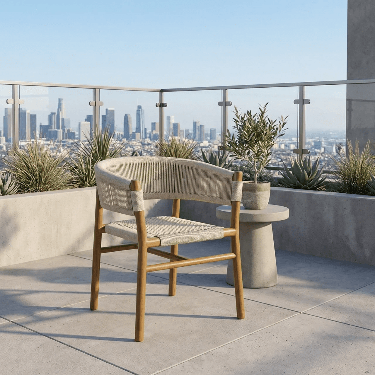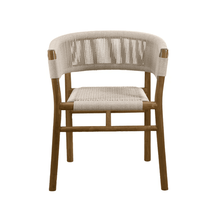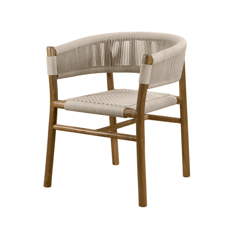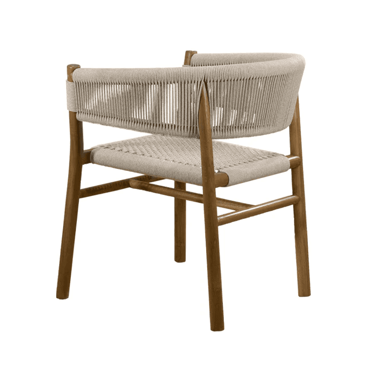 Silla de teca y cuerda, su forma versátil se adapta fácilmente a cualquier ambiente.