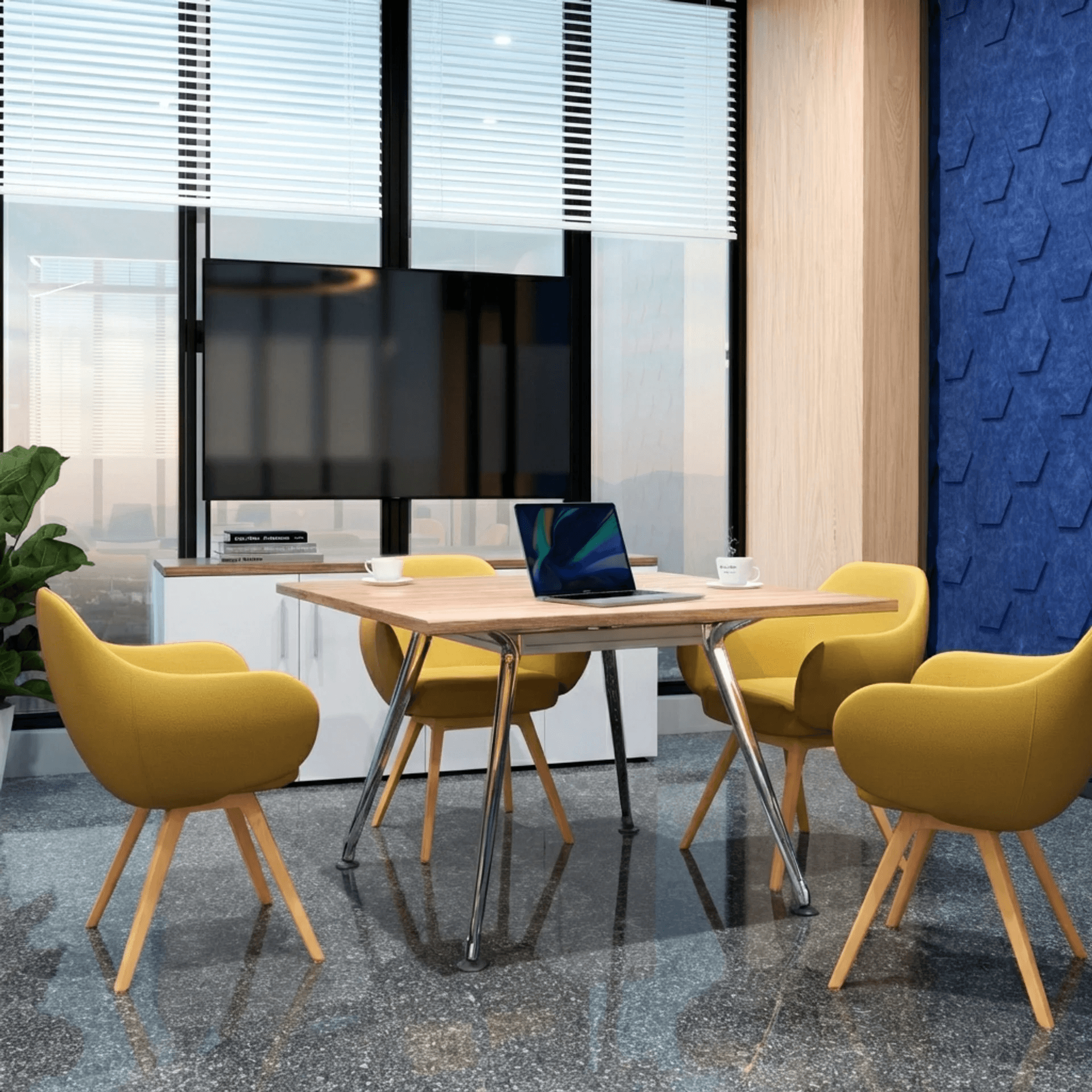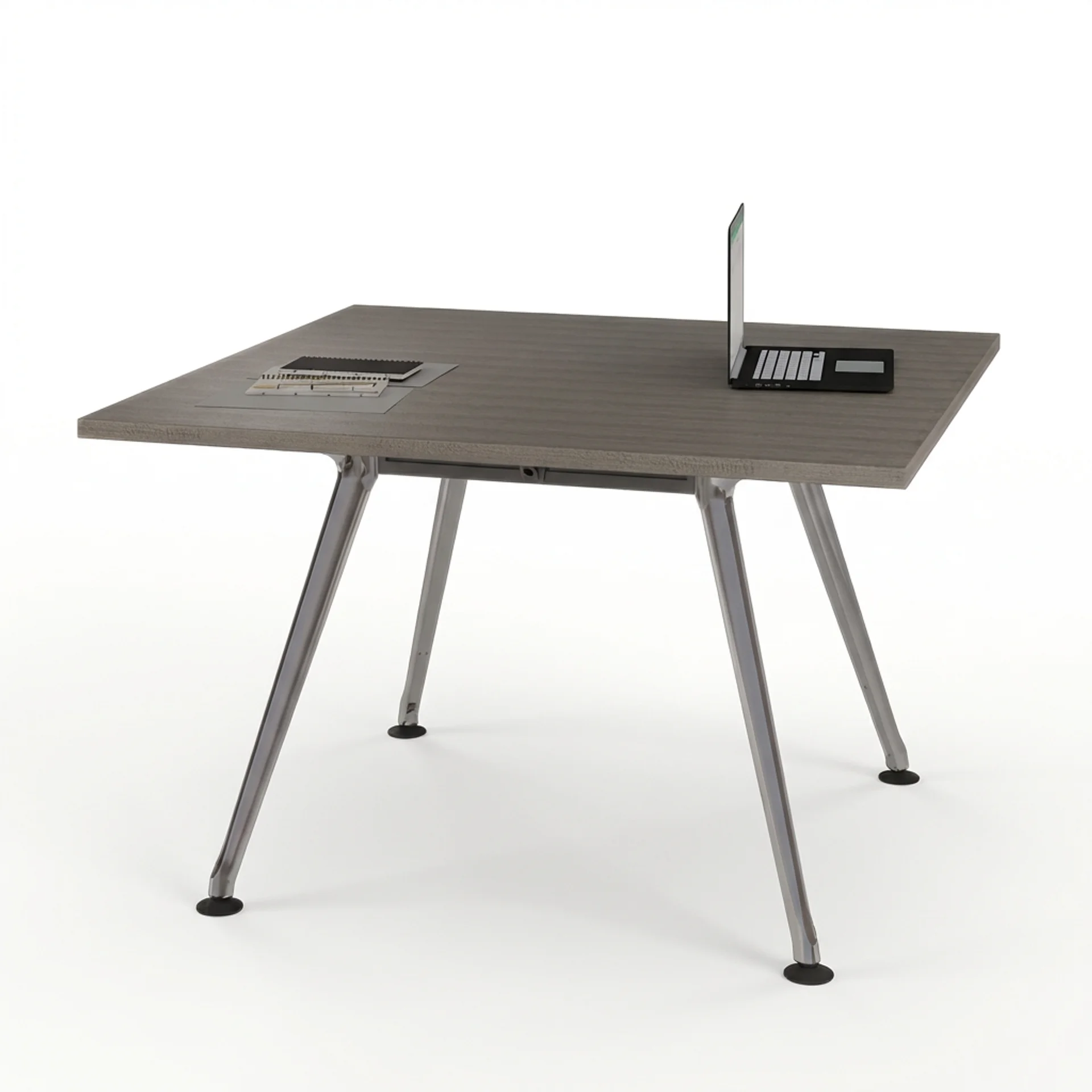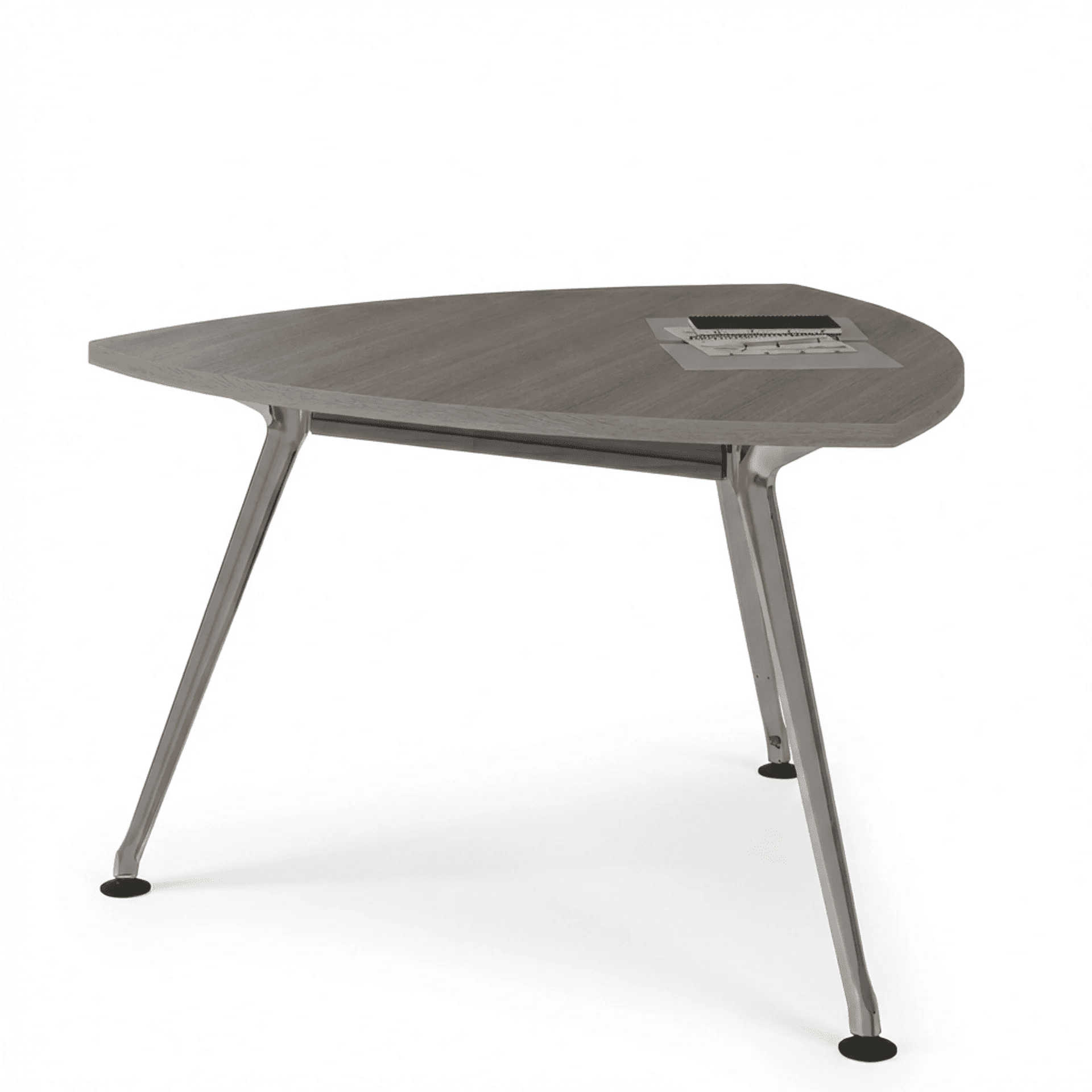 Mesa de diseño moderno y elegante, ideal para áreas de colaboración, juntas rápidas o espacios operativos. Su estética limpia con acabados cromados aporta un look contemporáneo que se adapta fácilmente a distintos entornos de oficina.