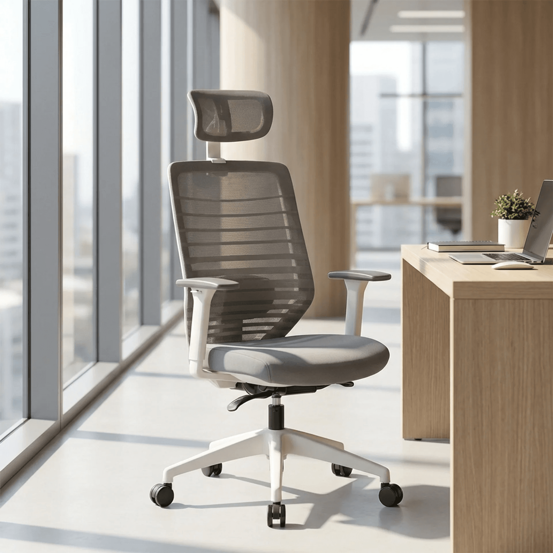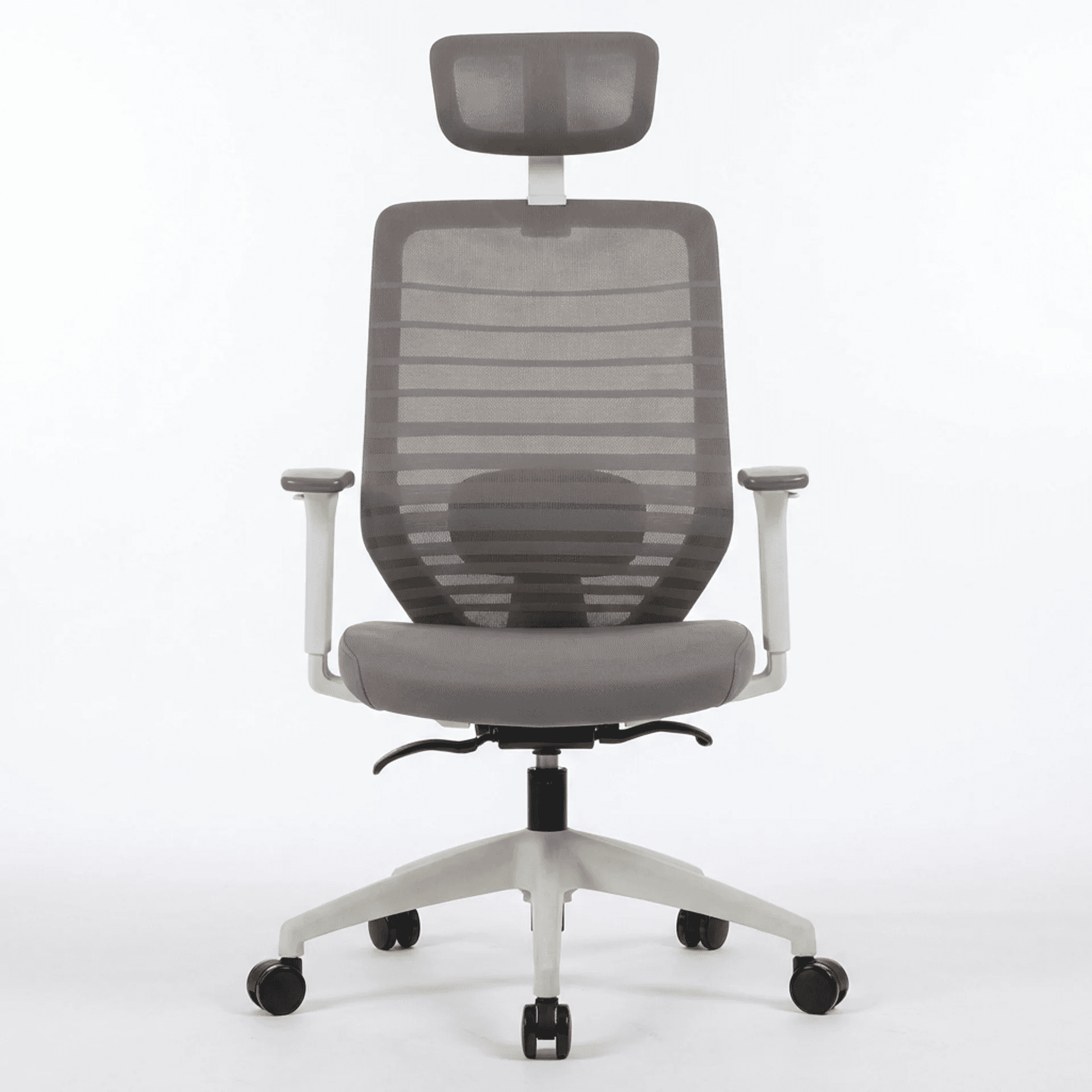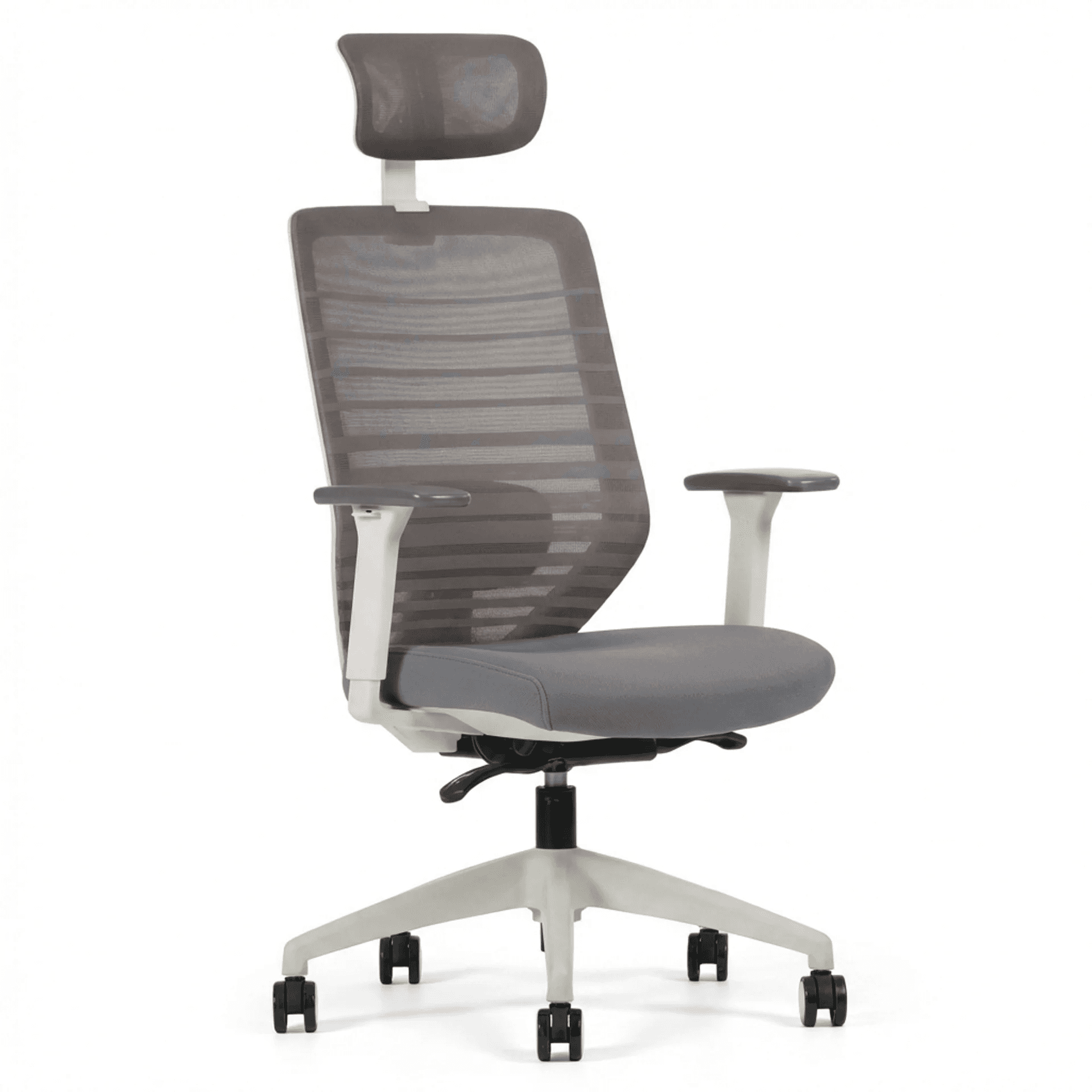 Silla con respaldo de malla, cabecera y soporte lumbar ajustable. Cuenta con asiento de PU inyectado de 6 cm y mecanismo Synchro multiposiciones, base spider gris y ruedas silenciosas de 50 mm.