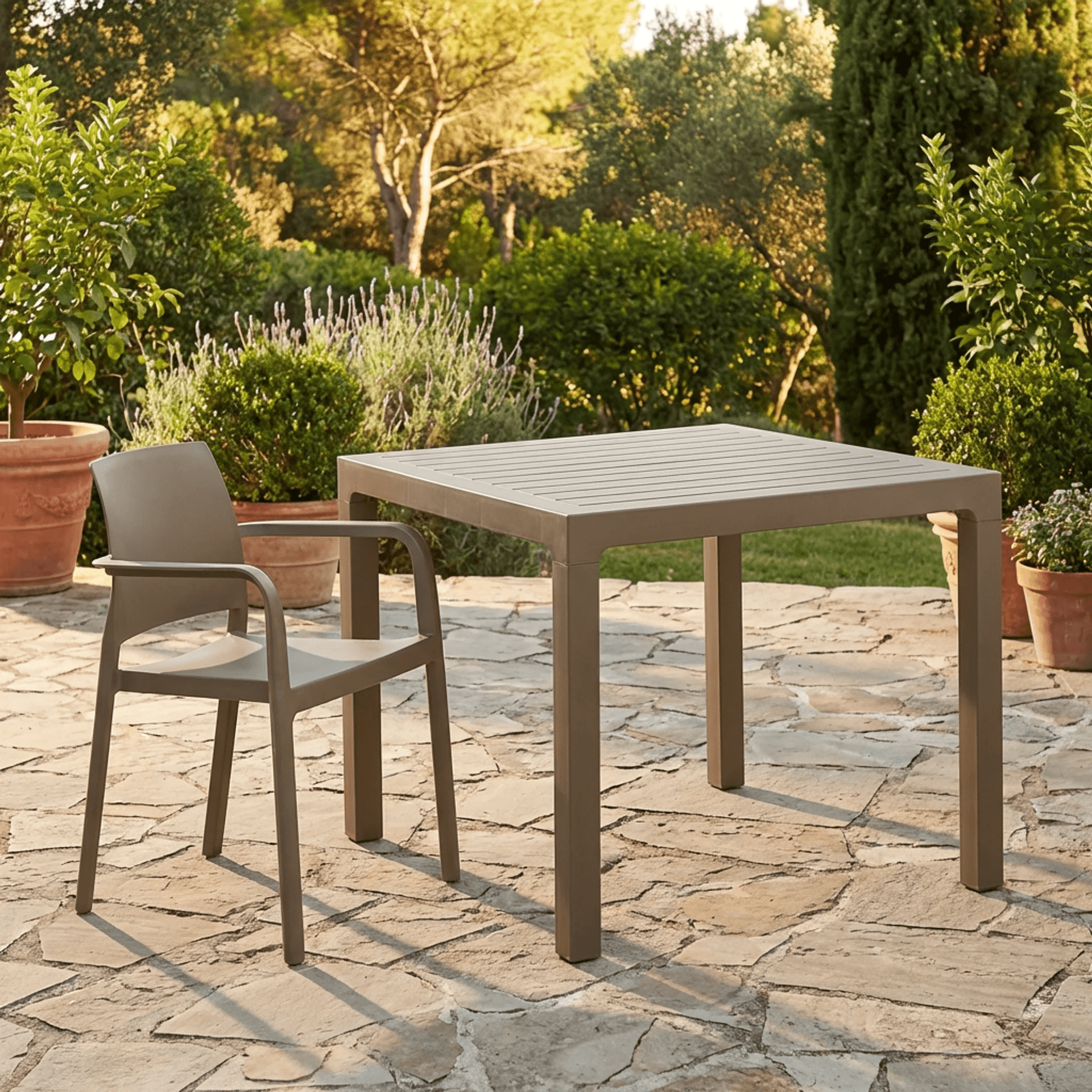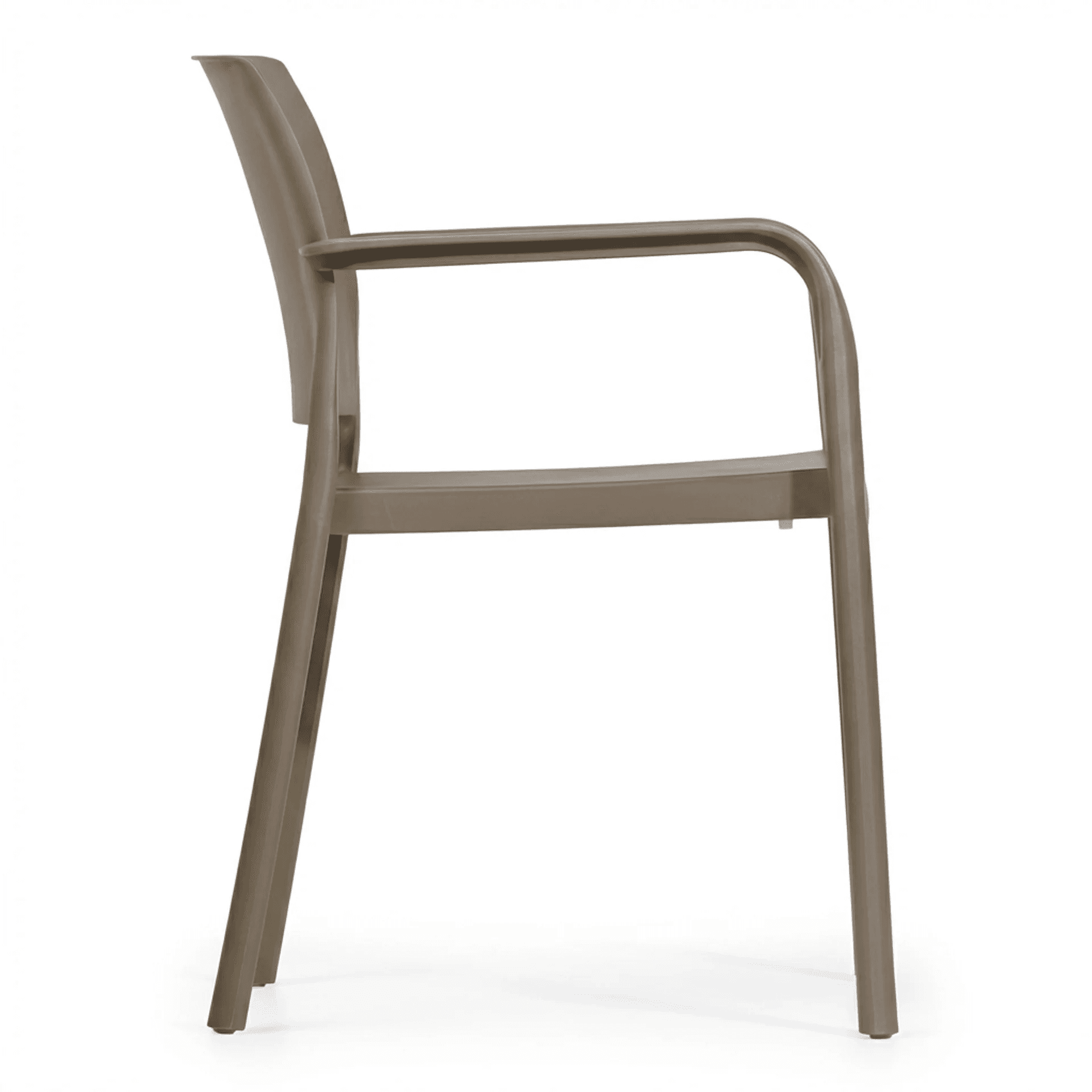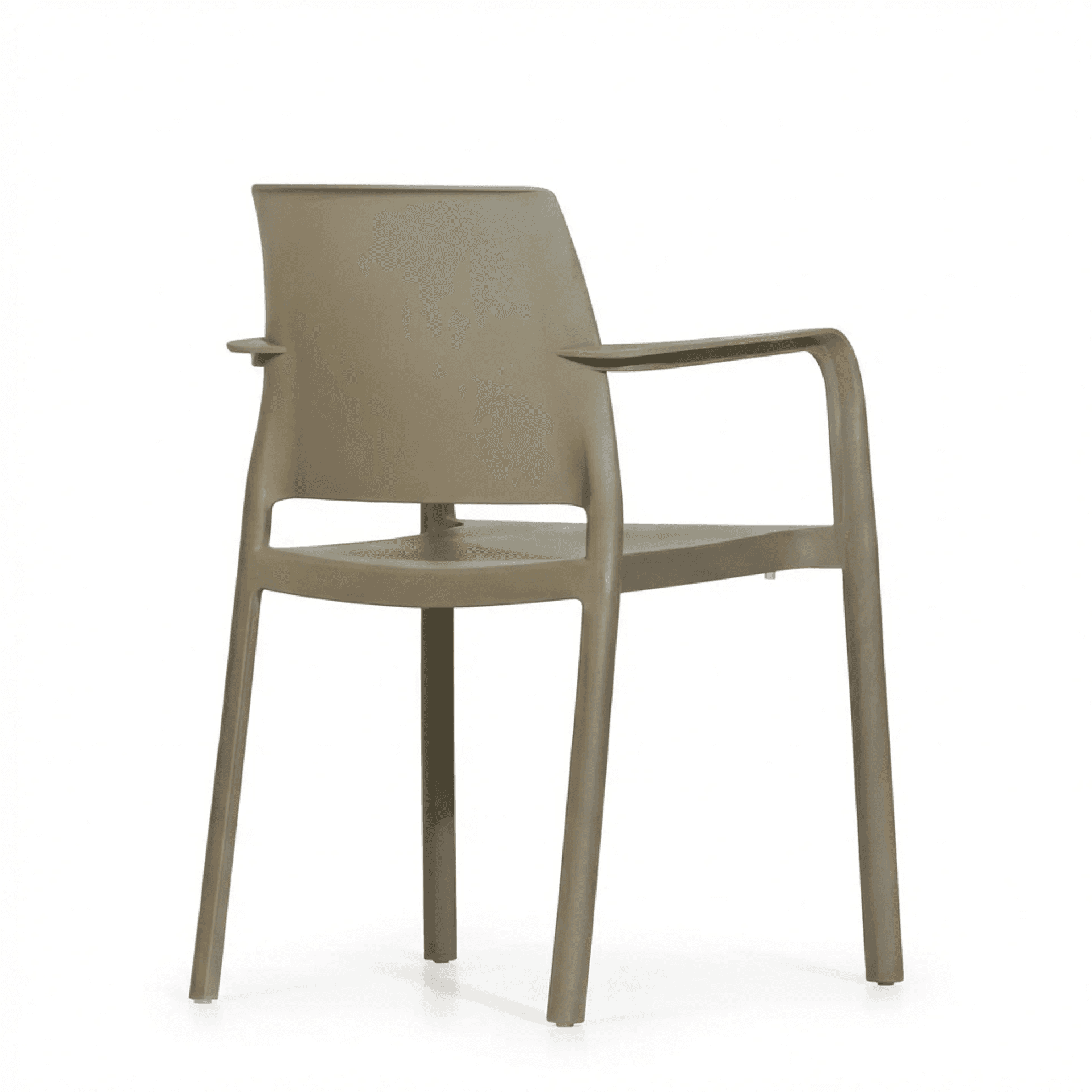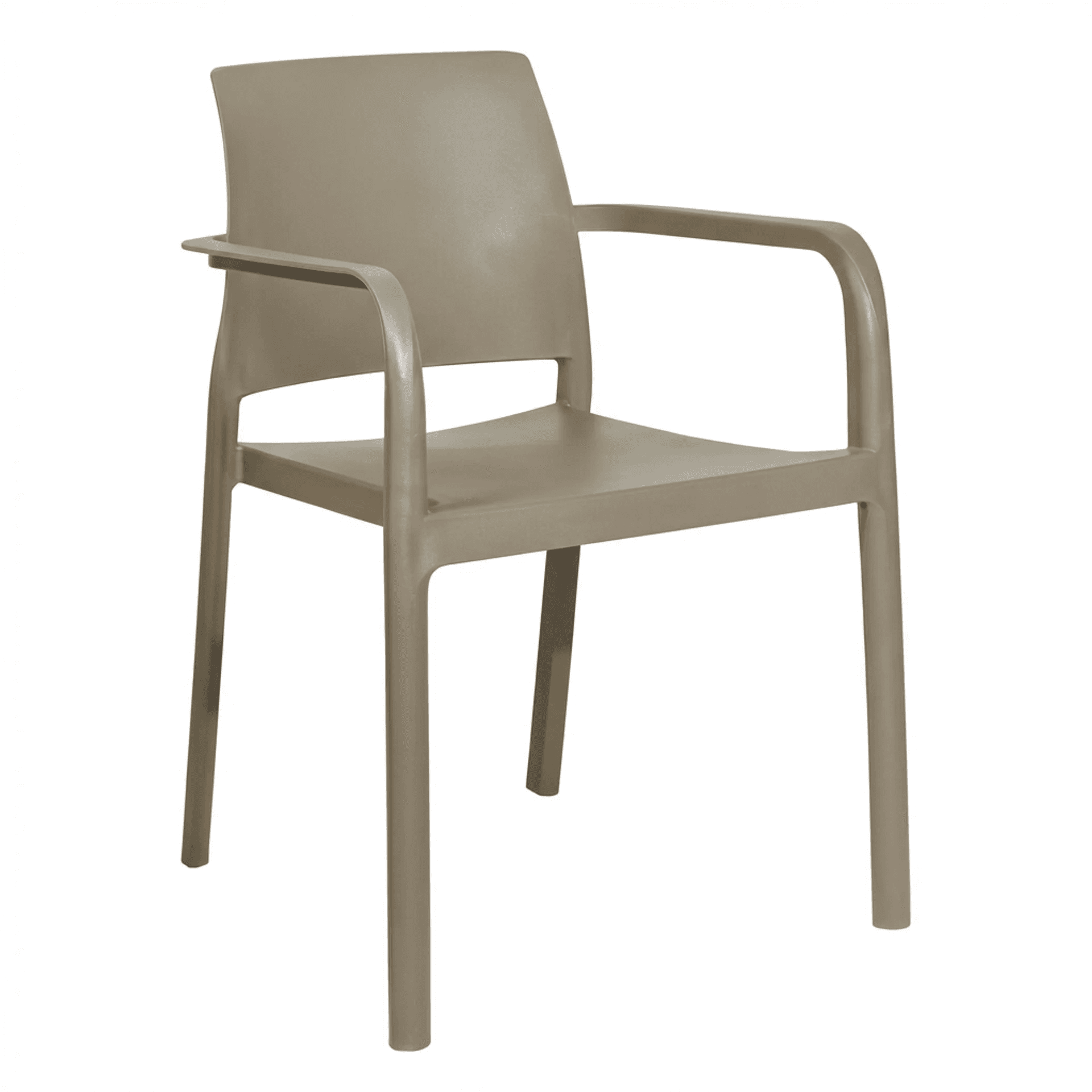 Silla con brazos apilable para uso exterior e interior. Polipropileno reforzado con fibra de vidrio. Inyección por gas. Tacos antideslizantes. 100% reciclable. Anti UV. Muy fácil de lavar y desinfectar. Producto de uso público y doméstico.