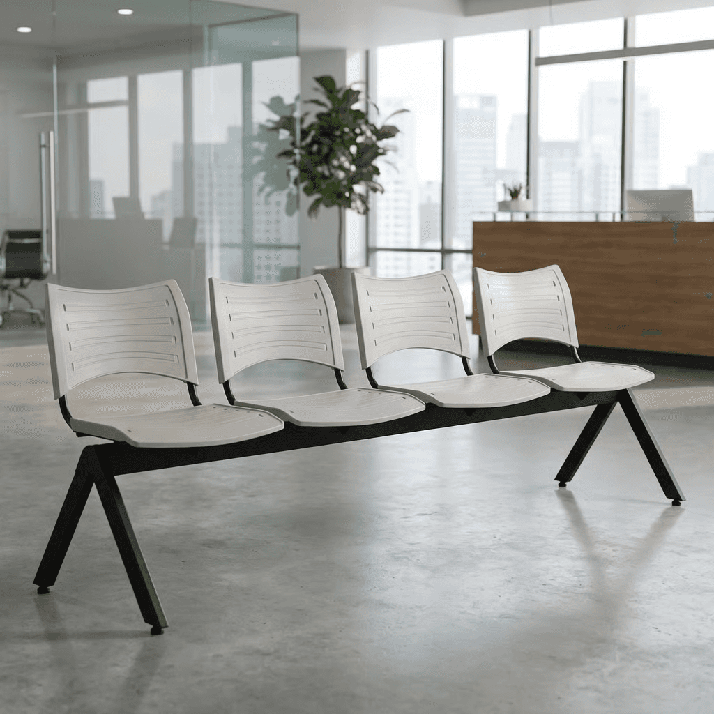 Estructura: Acero tubular rectangular de 1 1/2" X 3", calibre 16. Asientos y respaldos de perfil redondo tubular ponchado de acero con travesaños separadores tubulares redondos de acero, con acabado de pintura epóxica (electrostática) color negro.1 Respaldo y Asiento: En dos piezas de polipropileno de alta resistencia y duración.23 Color: Blanco, gris, gris cálido, negro, verde, azul, berenjena, rojo y naranja. Resistencia: Peso sugerido 360 kgs.