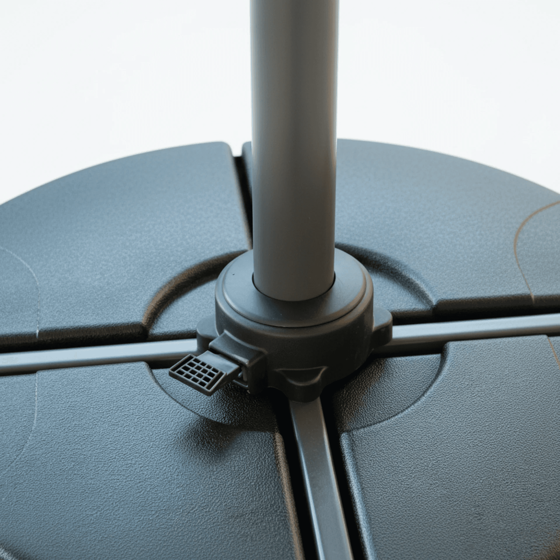 Sombrilla redonda con estructura de aluminio anodizado que incorpora sistema de ajuste de altura, giro de 360º y manivela para facilitar su uso y adaptación al movimiento del sol.