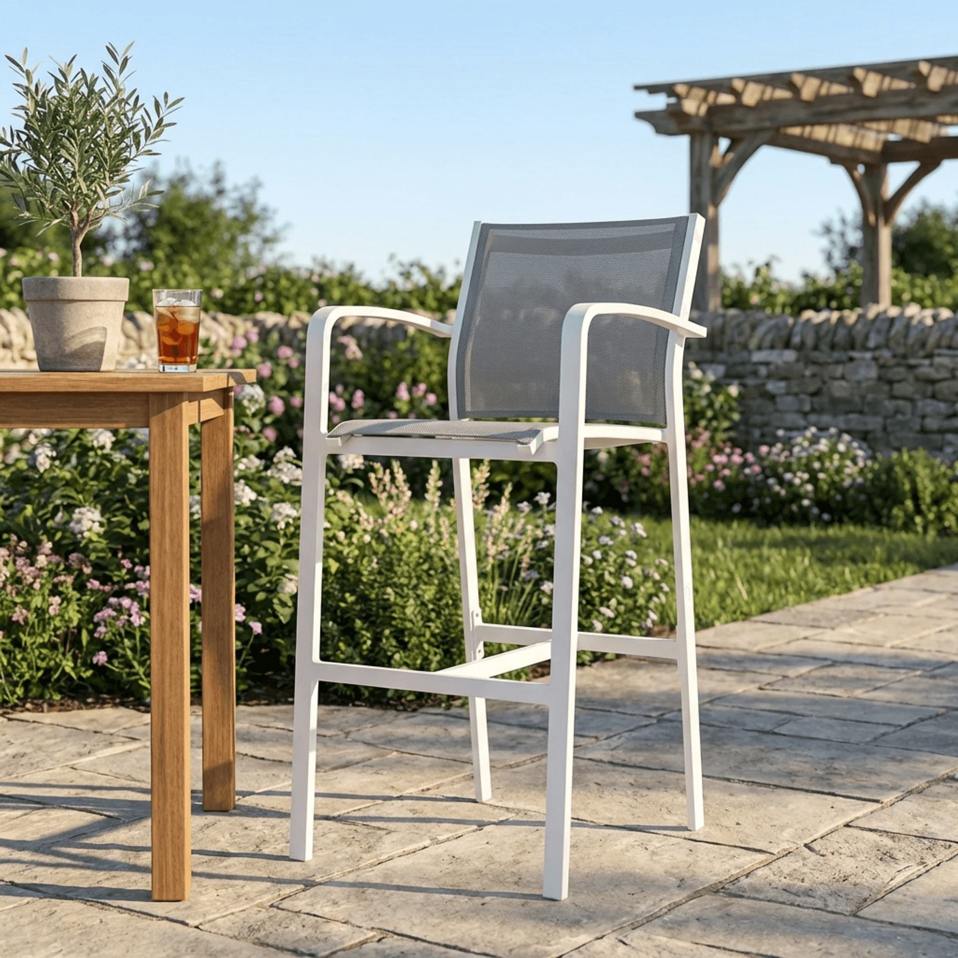 Banco que destaca por su estructura ligera, ergonomía y acabados refinados, ideales para terrazas, jardines o comedores al aire libre.