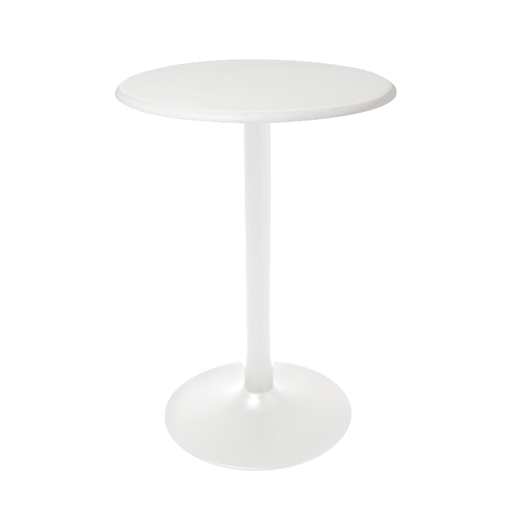 Mesa Heron con pedestal de acero y cubierta de polipropileno, diseñada para uso interior y exterior, con peso sugerido de 40 kg.