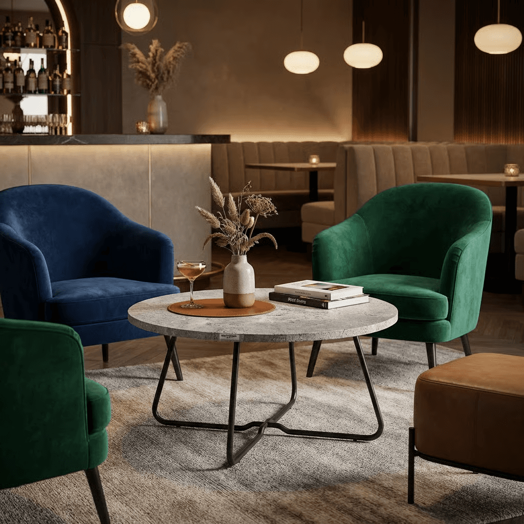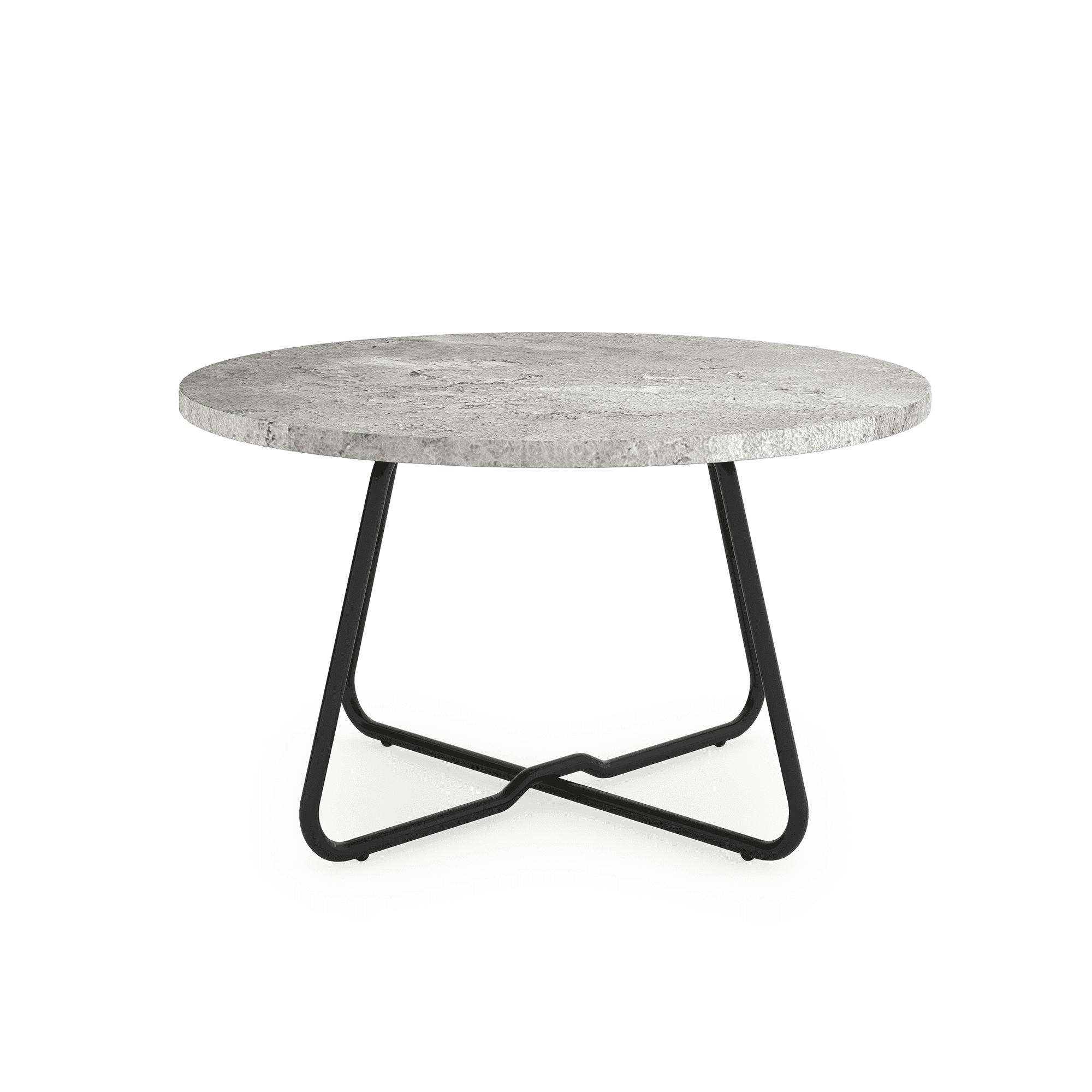 Mesa Marbel con base de acero y cubierta de laminado plástico (LPAP) en color travertino. Su cubierta tiene un diámetro de 600 mm y soporta un peso sugerido de 60 kg.