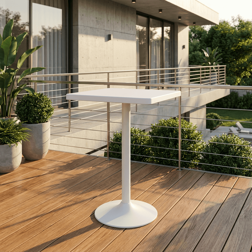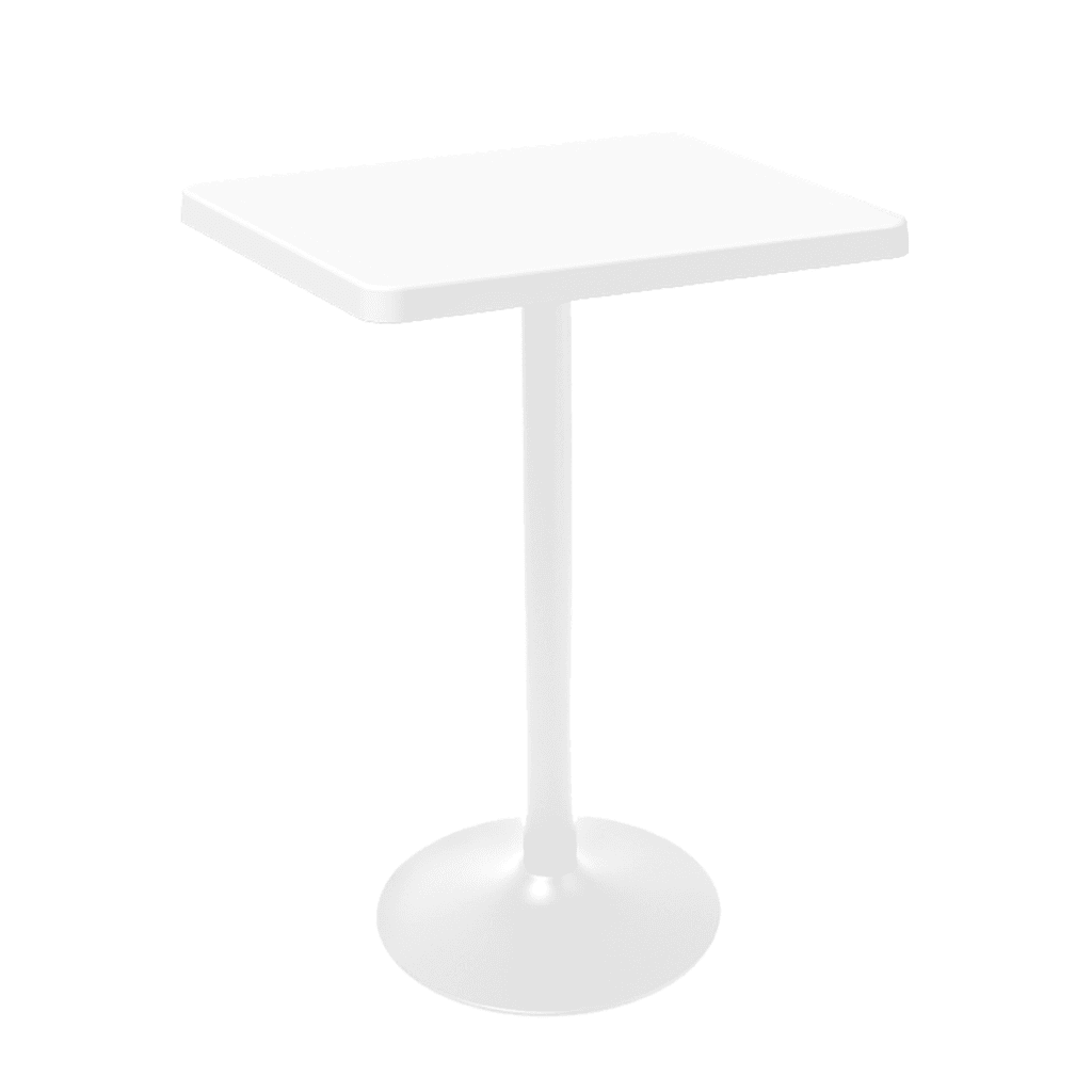 Mesa Oulu con pedestal de acero y cubierta de polipropileno, apta para uso interior y exterior, con peso sugerido de 50 kg.