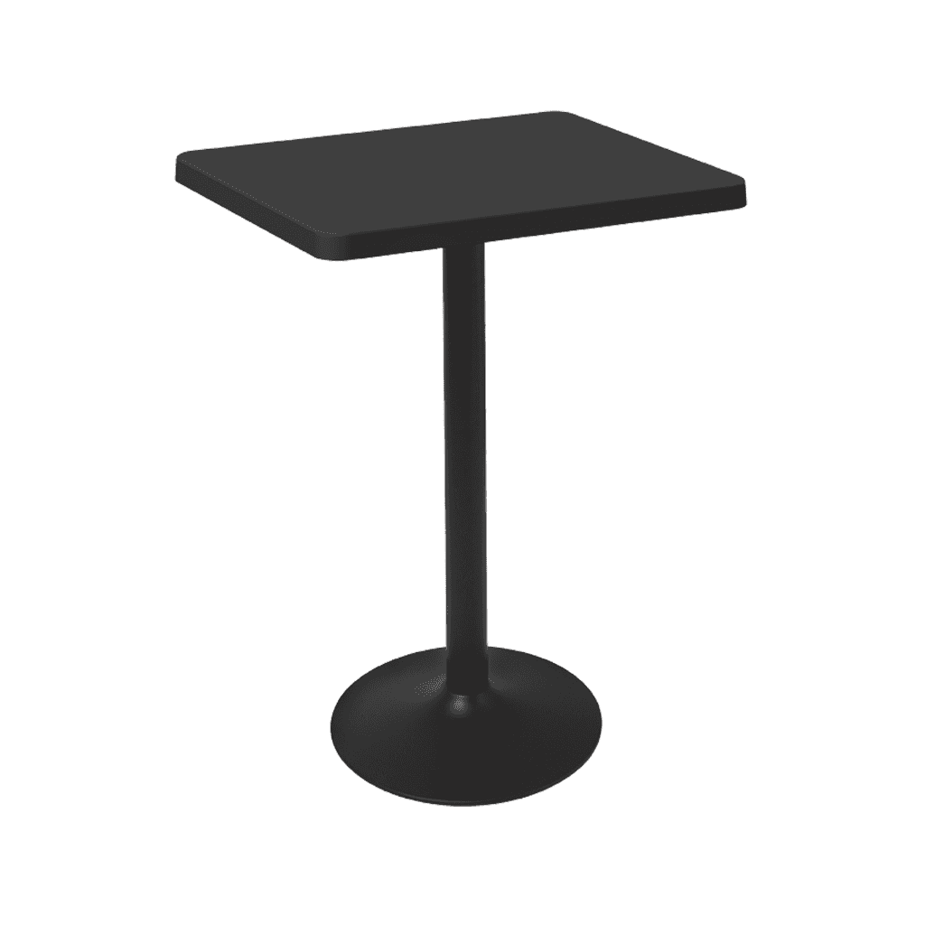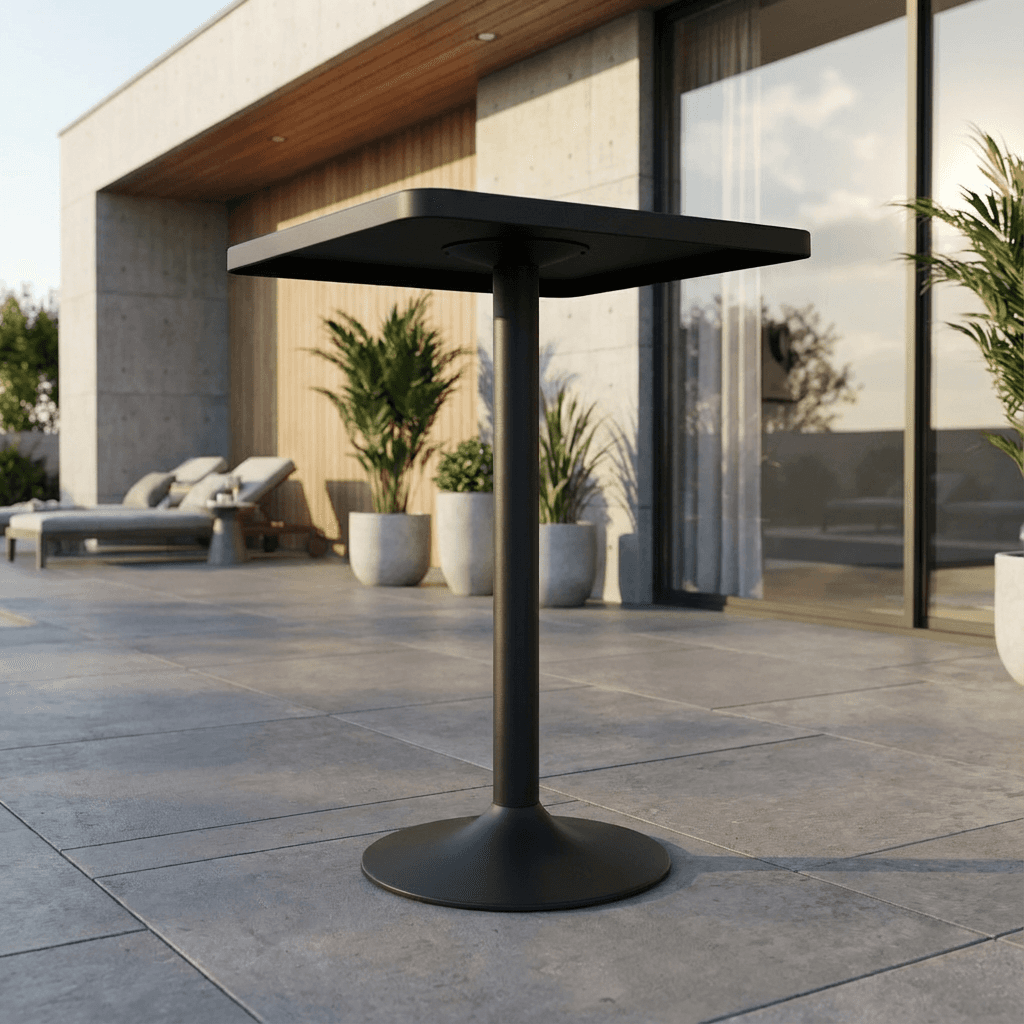 Mesa Oulu con pedestal de acero y cubierta de polipropileno, diseñada para interior y exterior, con peso sugerido de 50 kg.