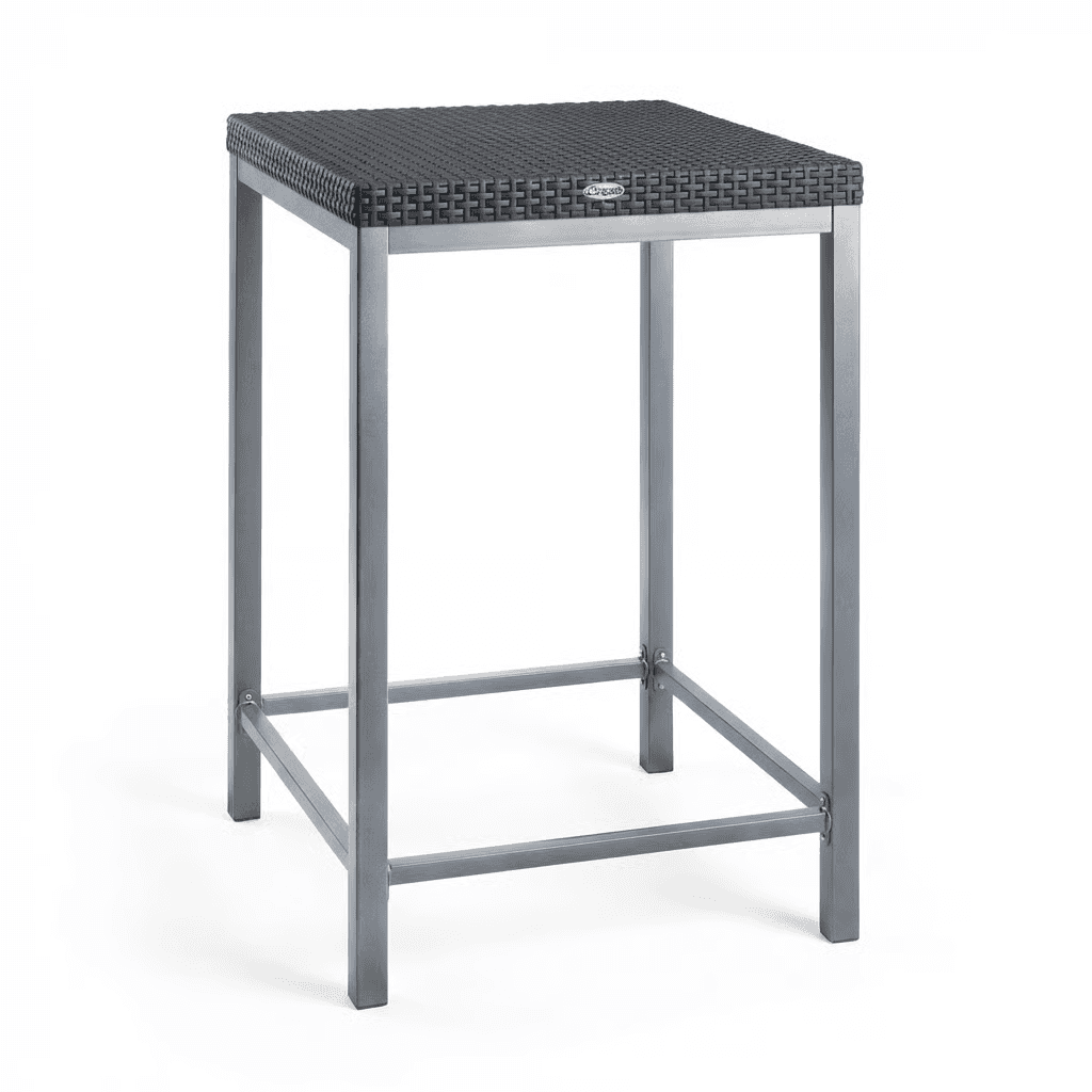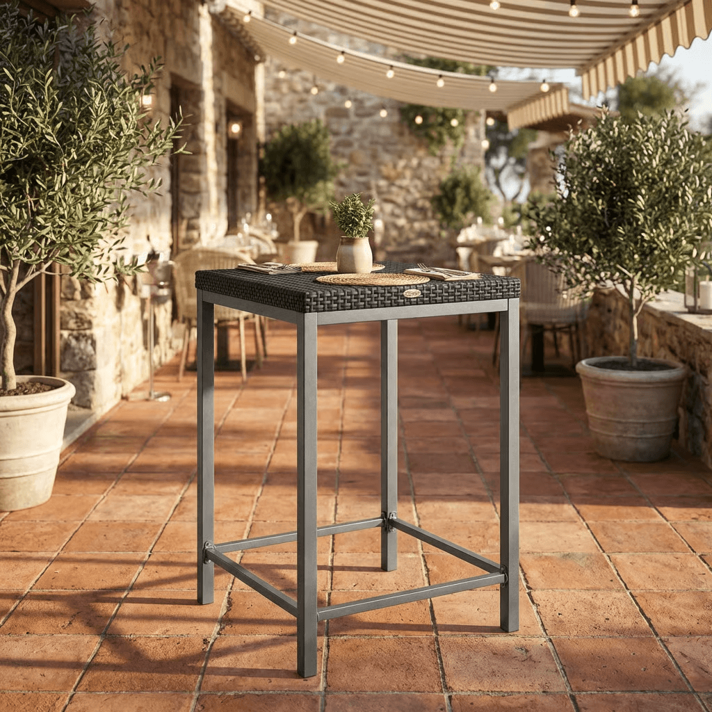 Mesa con diseño ergonómico, apta para uso en interiores y exteriores (a la intemperie). Es resistente a los rayos ultravioleta (UV) y al ambiente salino, con un terminado en imitación rattán.