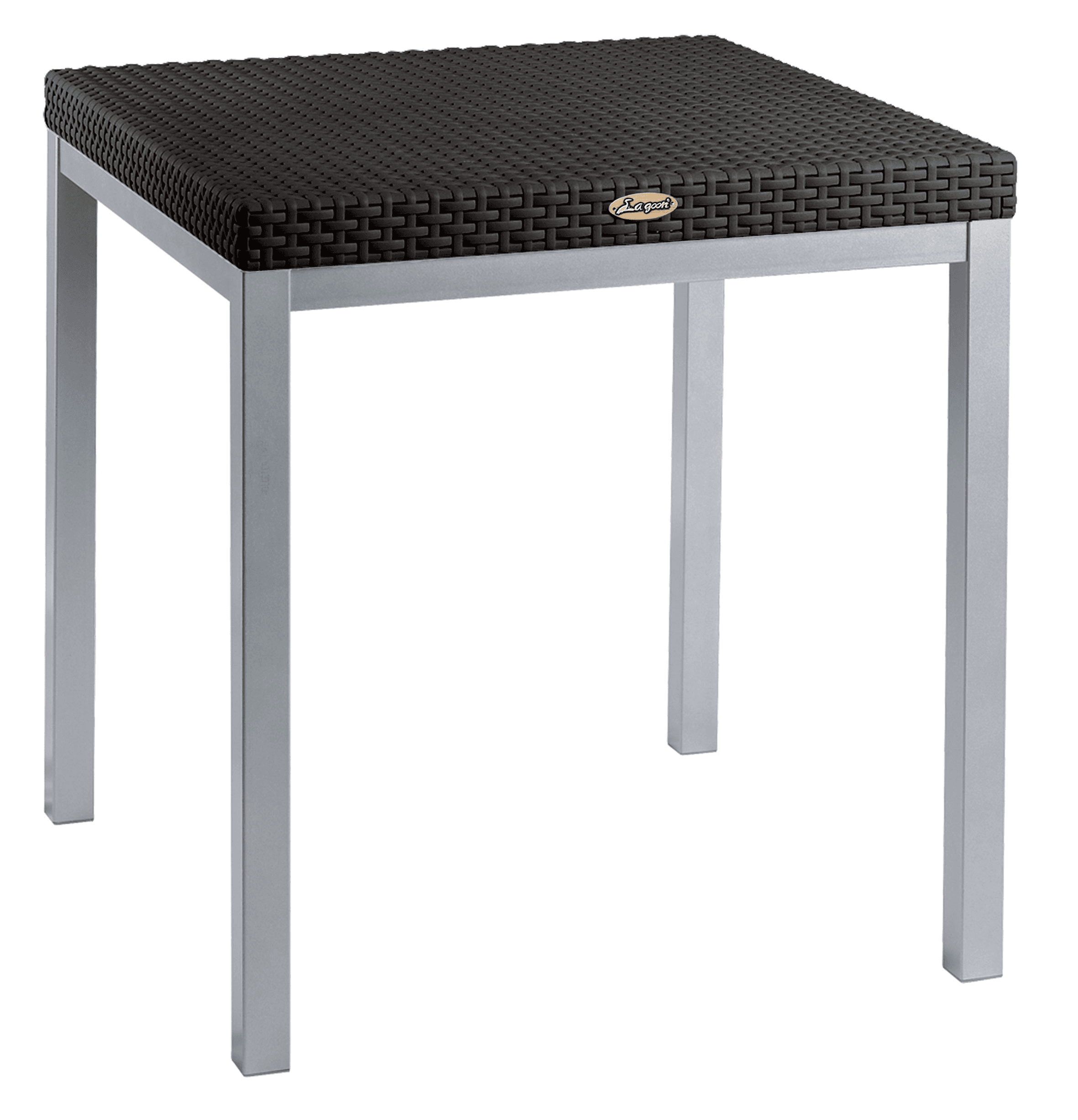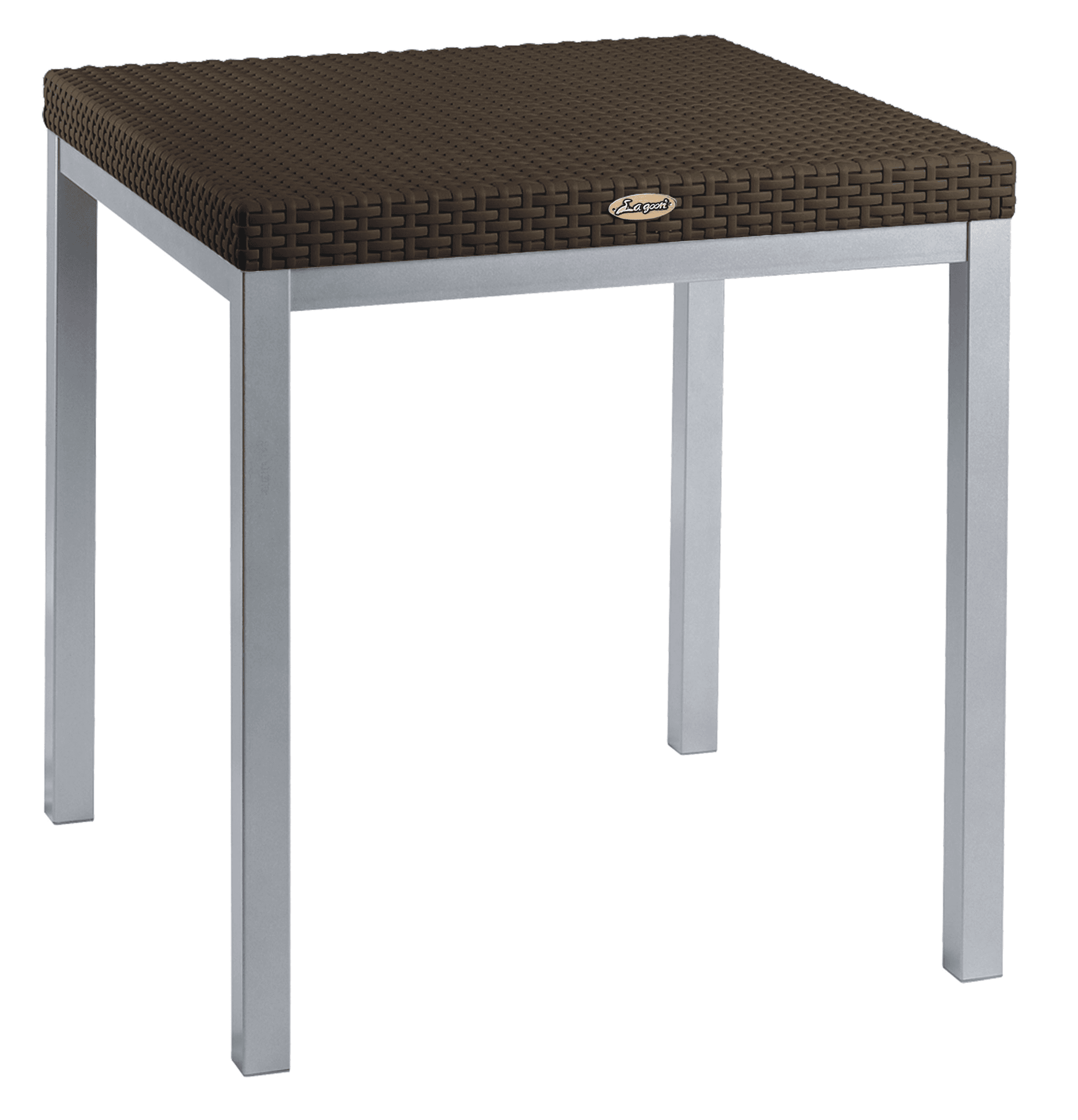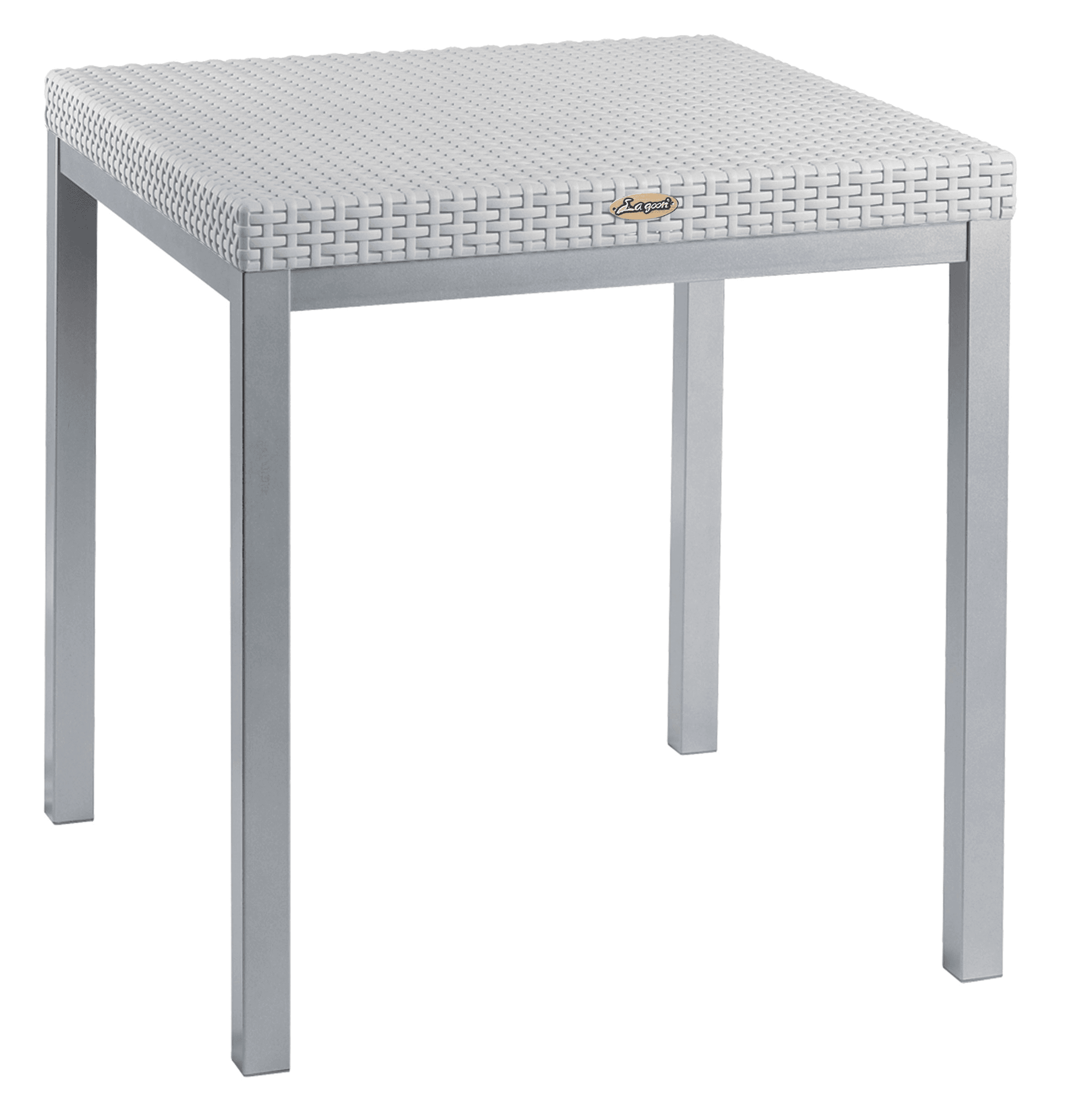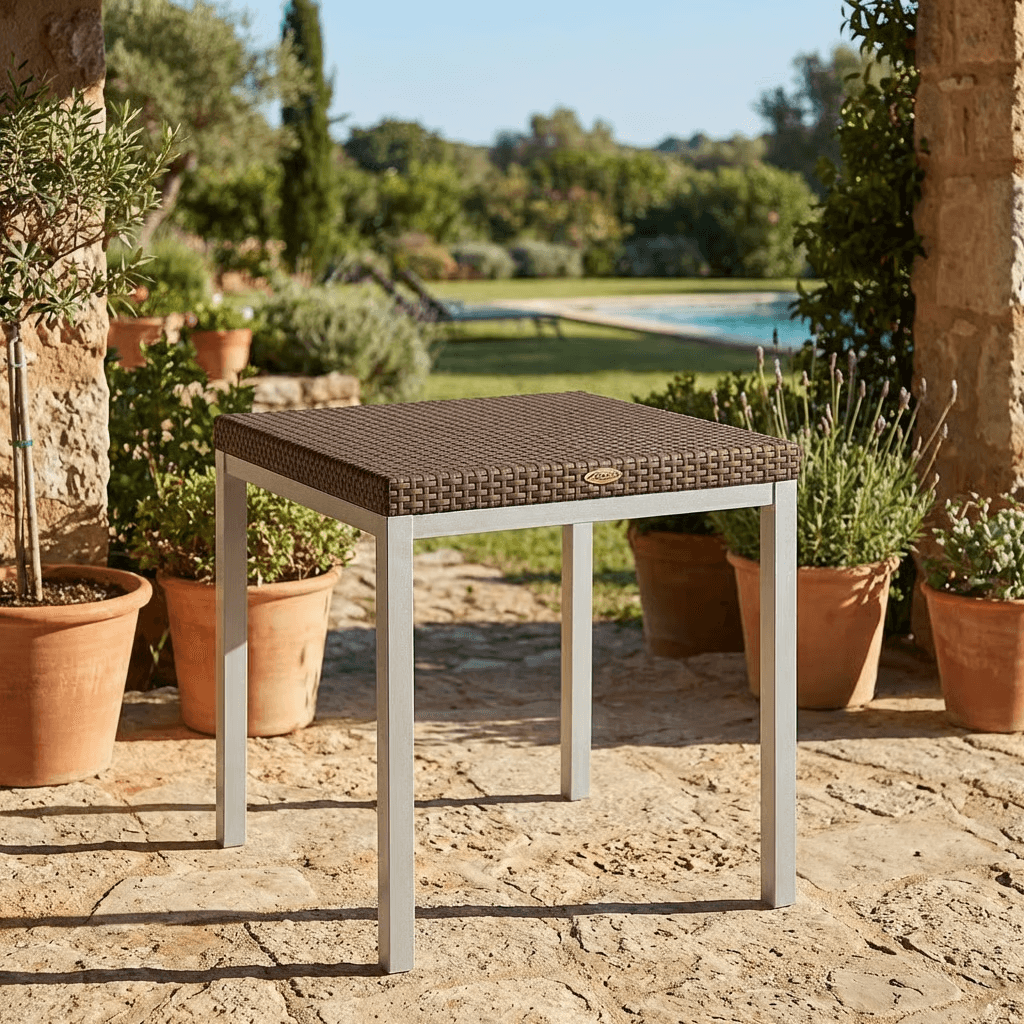 Mesa Russ para interior y exterior, con estructura de aluminio anodizado y cubierta de polipropileno tipo rattán, recomendada para soportar hasta 60 kg.