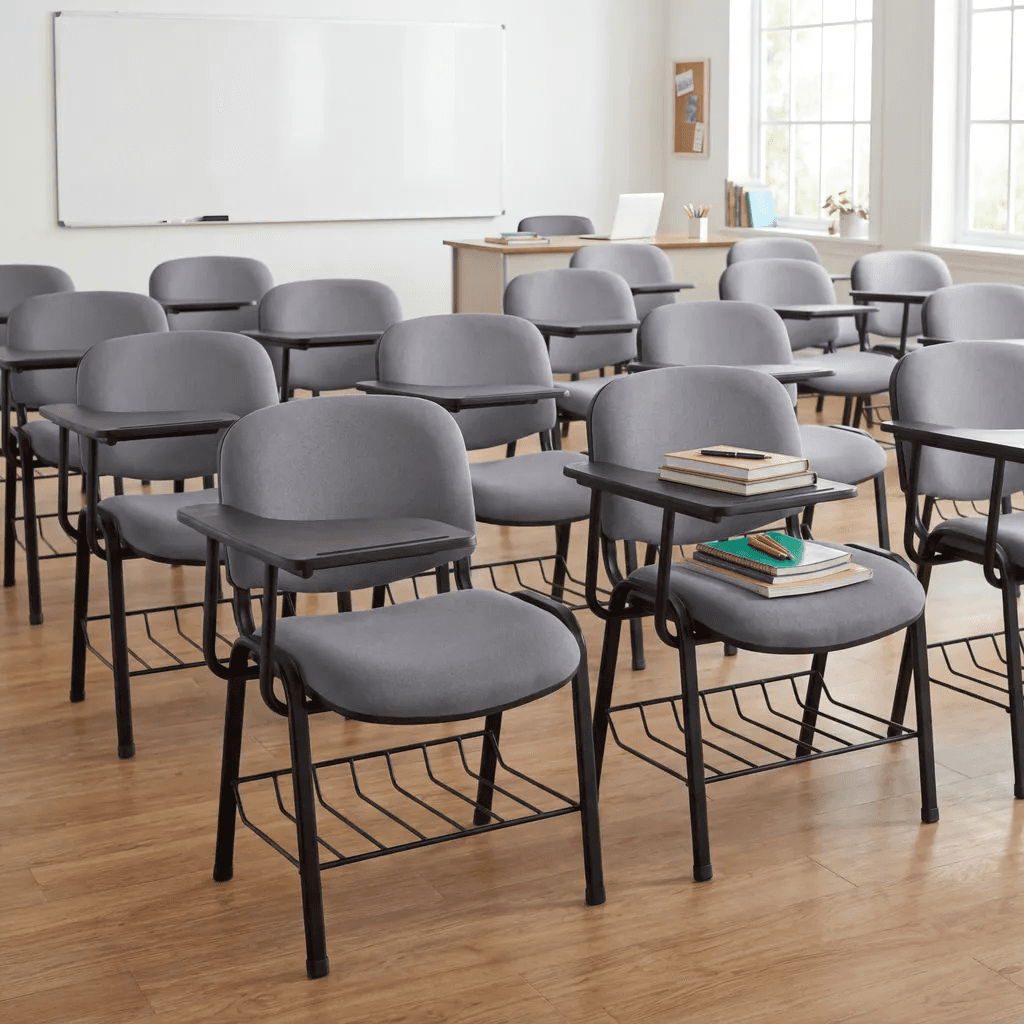Pupitre escolar elíptico individual con diseño ergonómico para aulas.