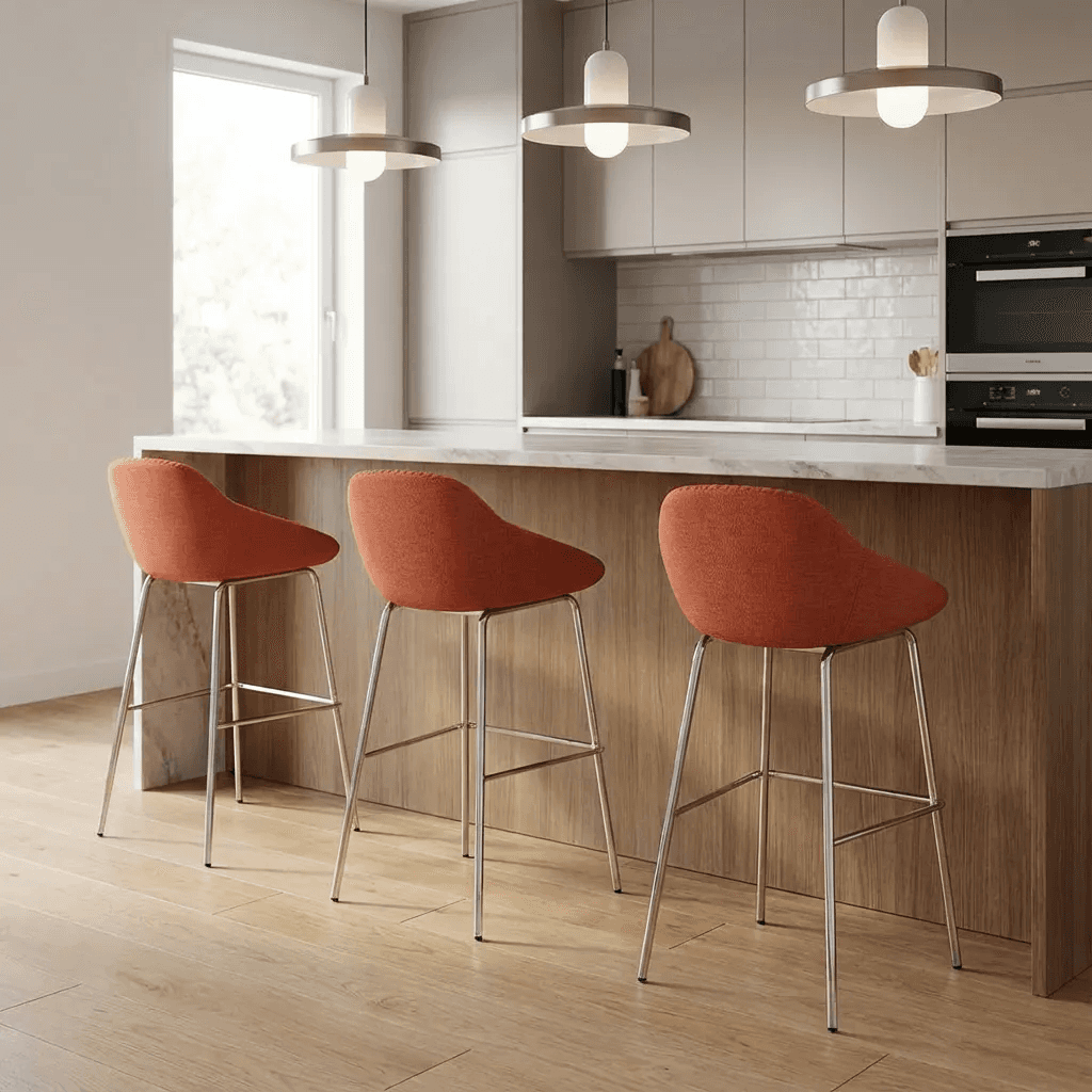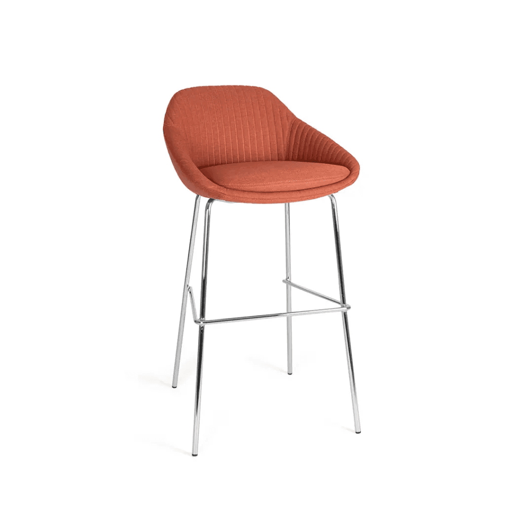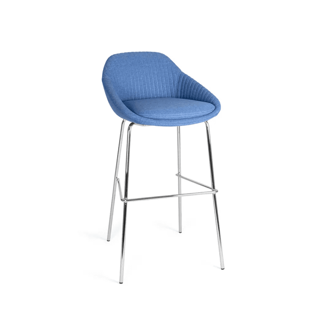 Silla alta con base metálica y asiento acolchado tapizado en tela de color a elegir, pensada para barras de cocina, restaurantes y áreas sociales modernas. Su estructura tubular de acero ofrece estabilidad y resistencia, mientras que el respaldo alto proporciona comodidad en usos prolongados.