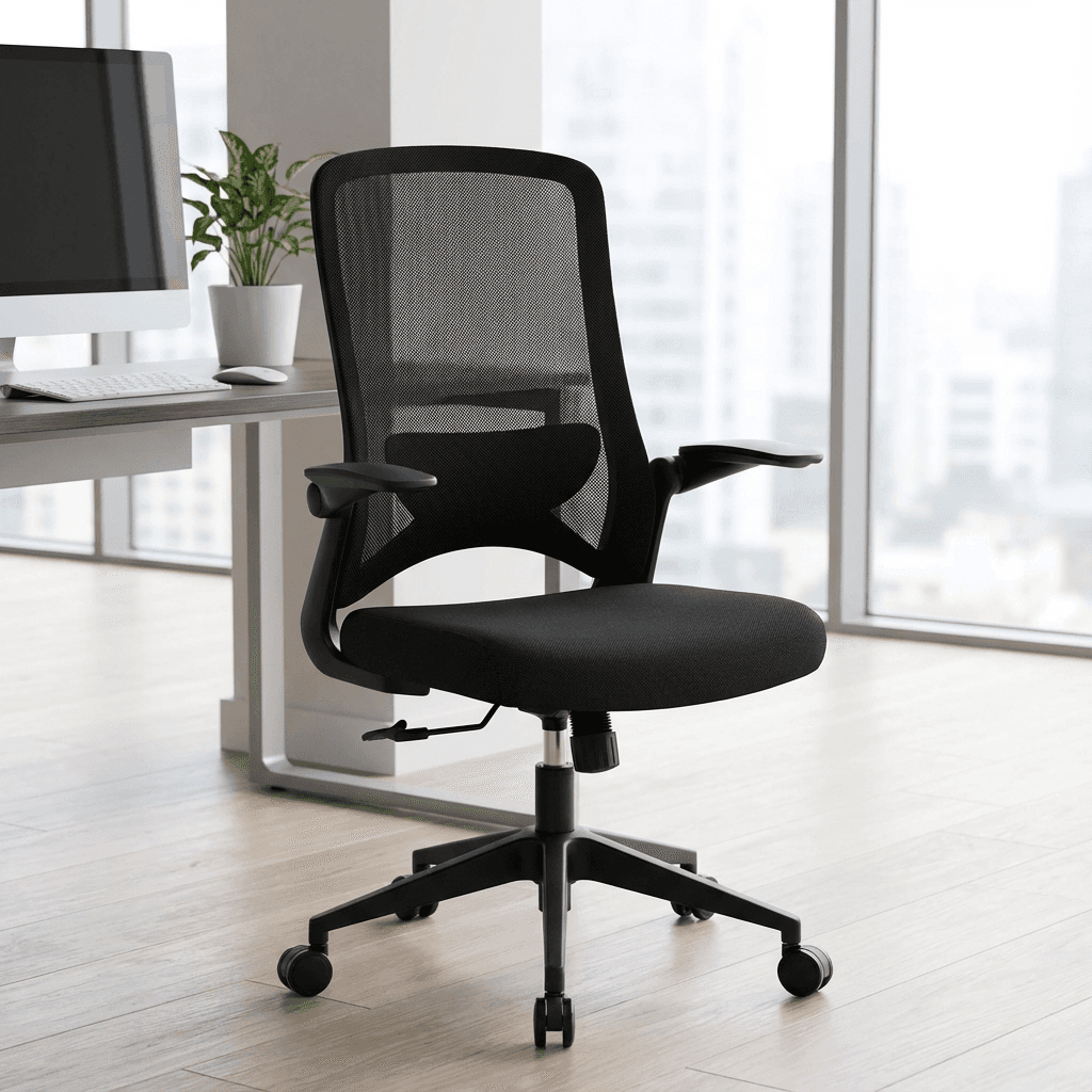 Silla operativa con base de ruedas, respaldo en malla ergonómica, brazos abatibles y mecanismo de altura ajustable.