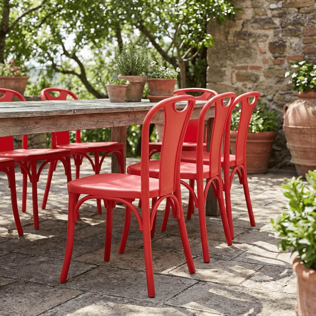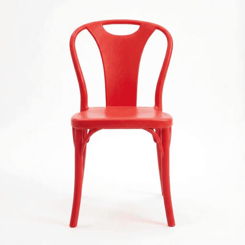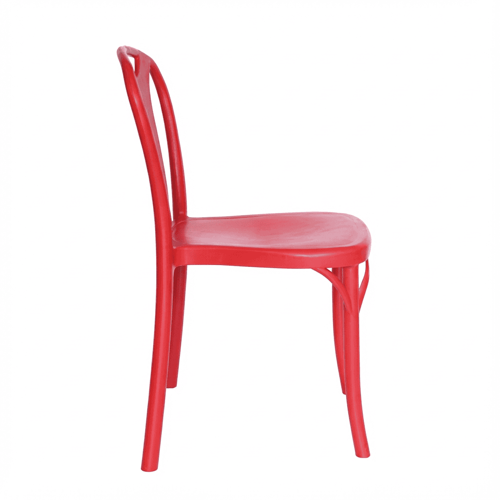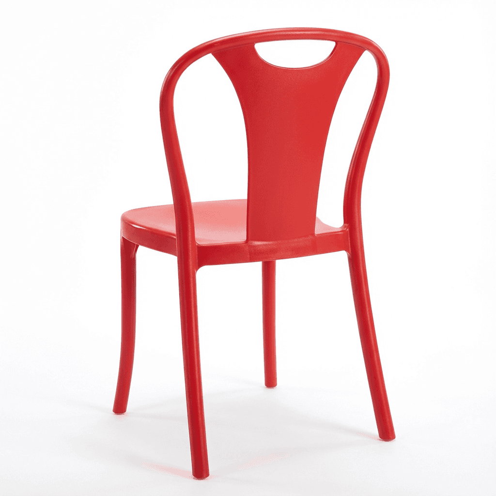 Silla BISTROT OHV-119 de la línea Econosillas, monobloque en polipropileno con protección UV, apta para uso en exteriores con peso sugerido de 150 kg. Disponible en colores negro y rojo, ideal para terrazas, cafeterías y comedores que requieren sillería resistente y fácil de limpiar.