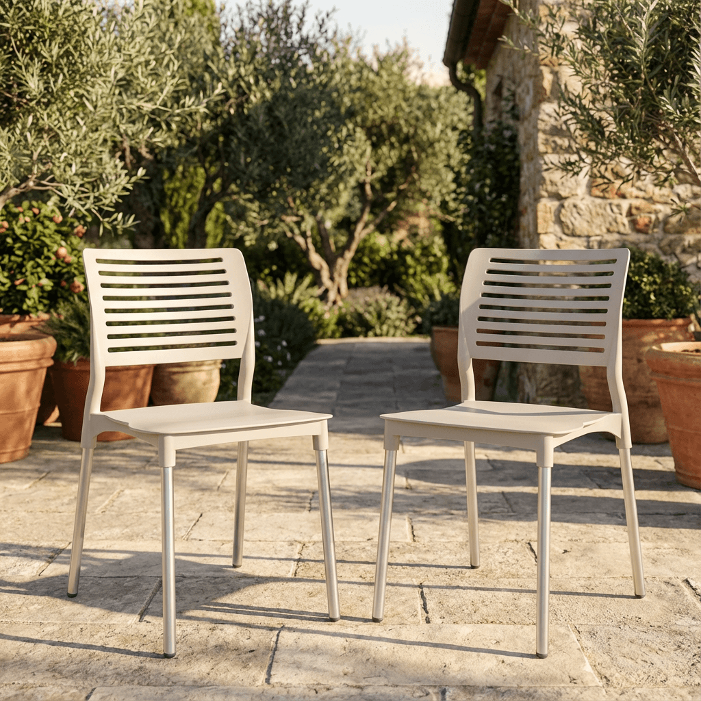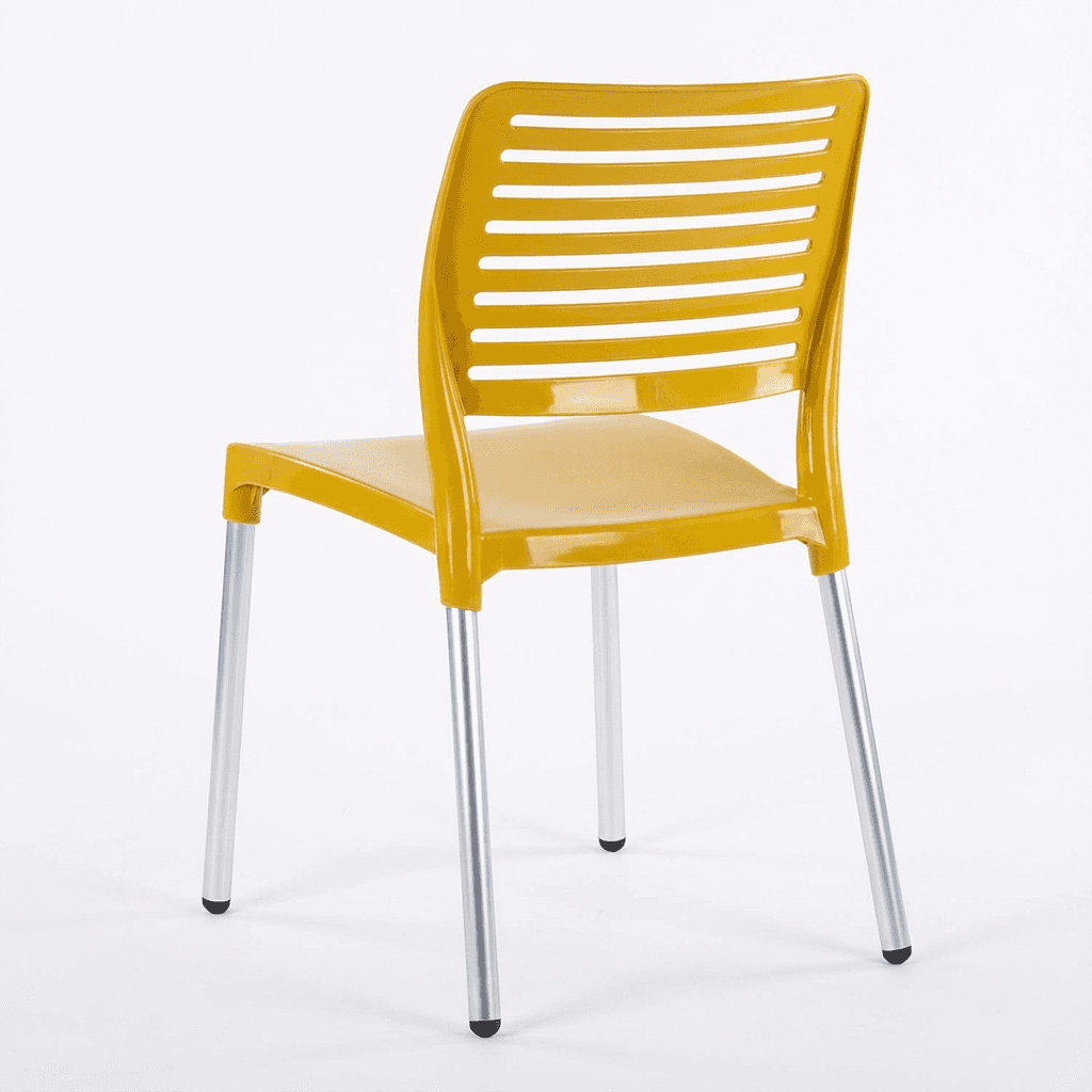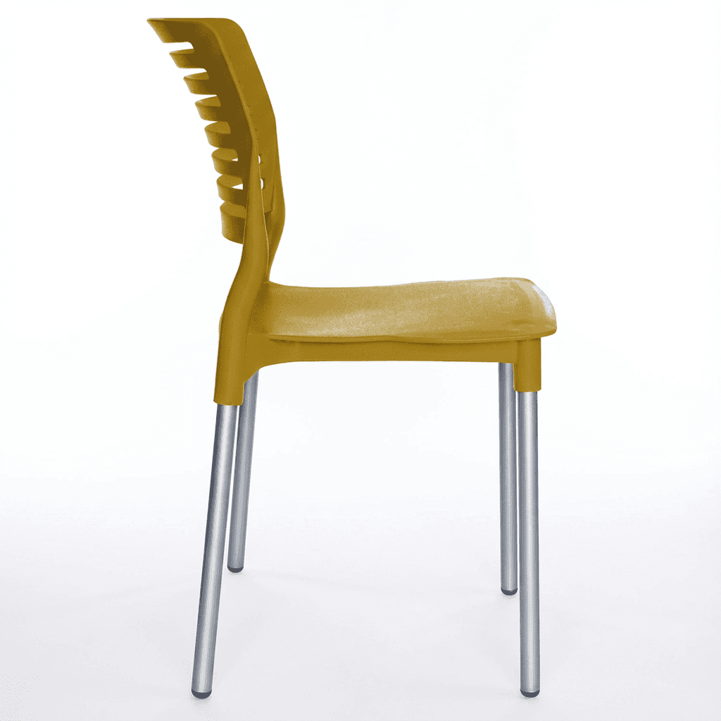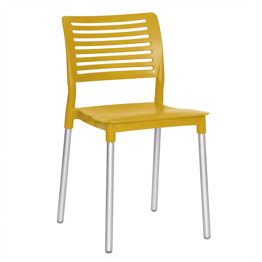 Silla BREEZE OHV-69 con patas de aluminio y casco en polipropileno, diseñada para uso en exterior con peso sugerido de 100 kg. Se fabrica en colores mostaza, blanco y rojo, adecuada para terrazas, cafeterías y áreas de descanso.