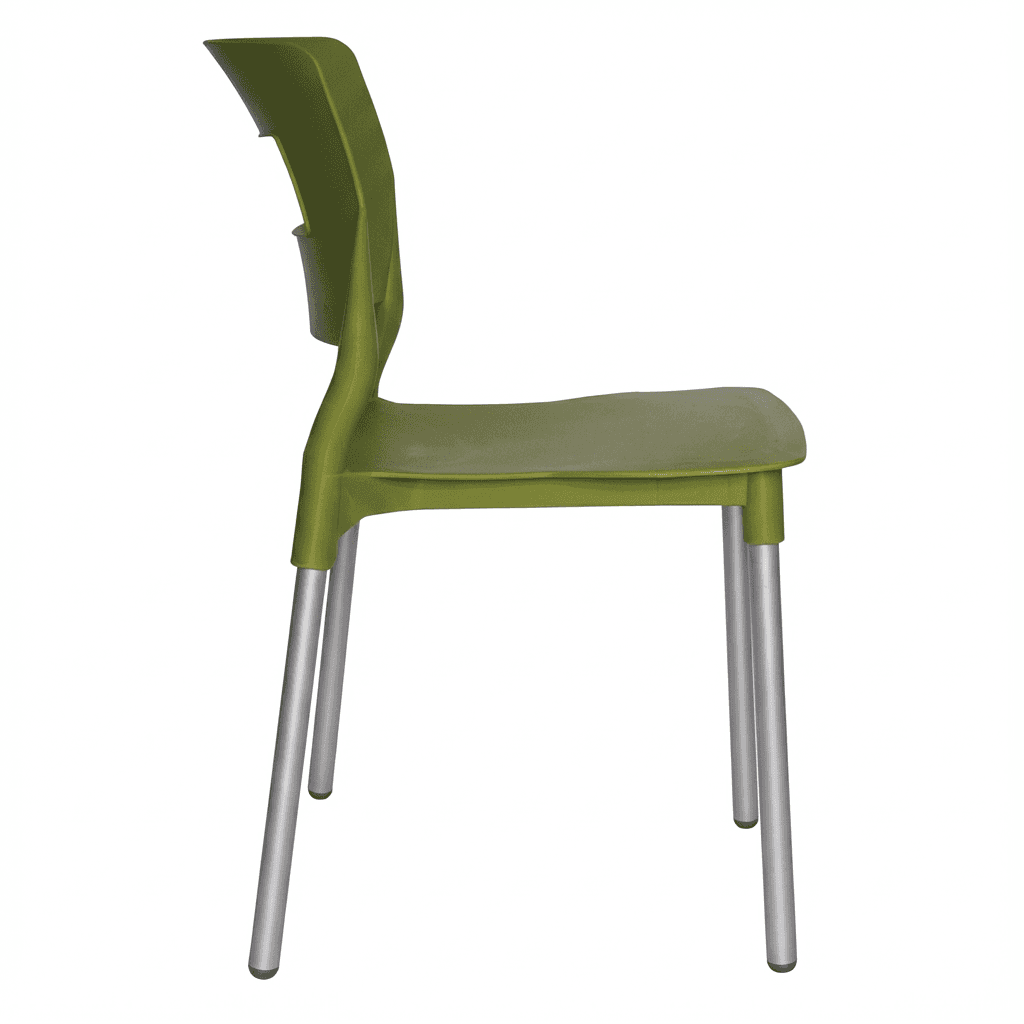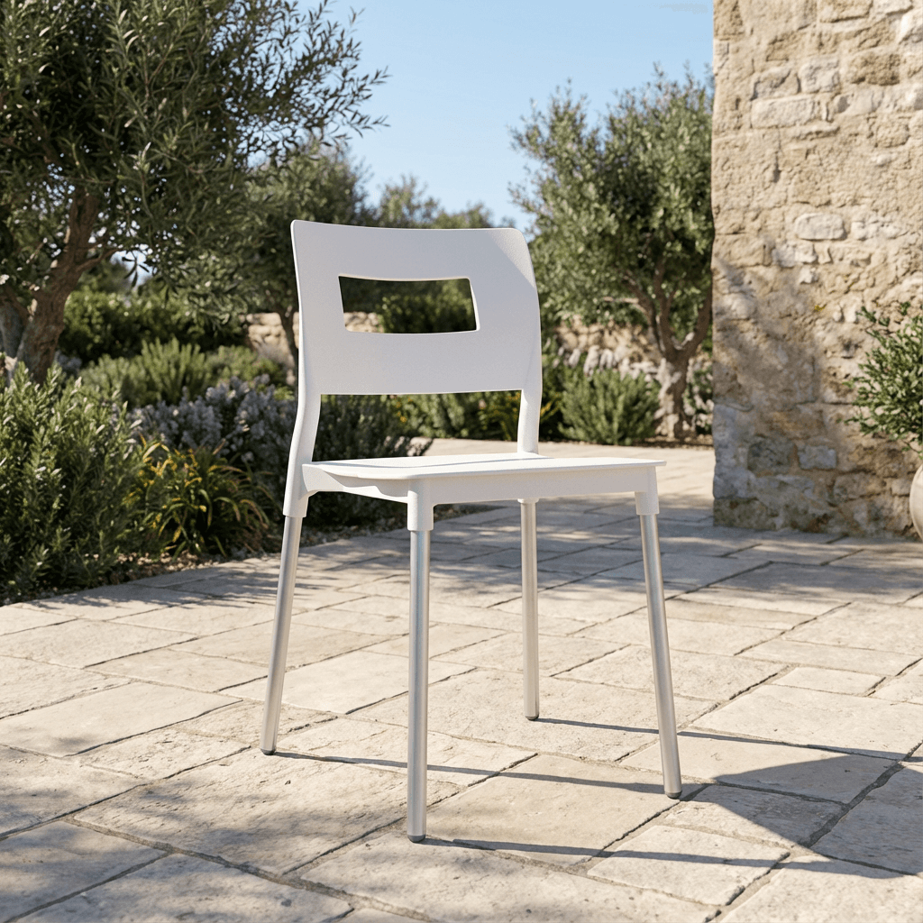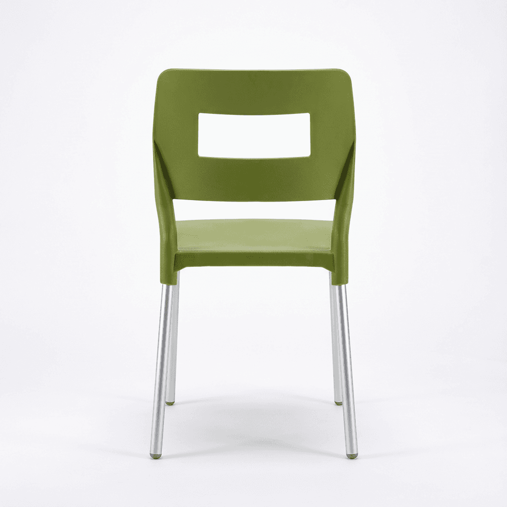 Silla SAND OHV-64 de la línea Econosillas, con estructura de patas de aluminio y casco en polipropileno resistente a intemperie, con peso sugerido de 100 kg. Disponible en colores blanco y olivo, ideal para terrazas, comedores al aire libre y áreas recreativas.