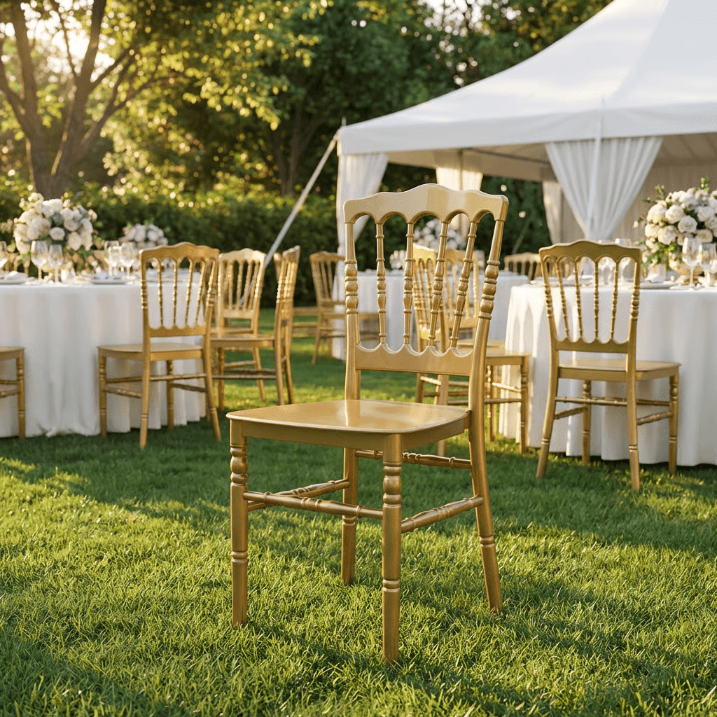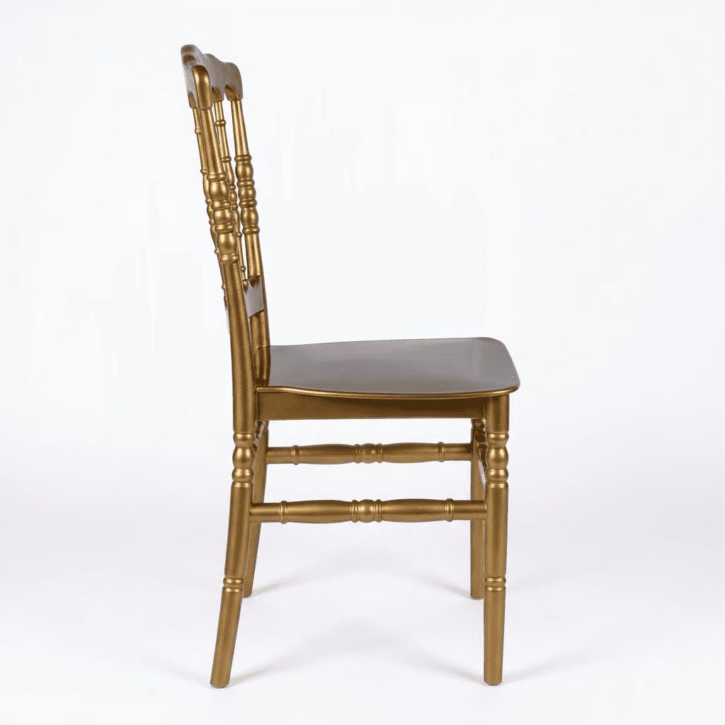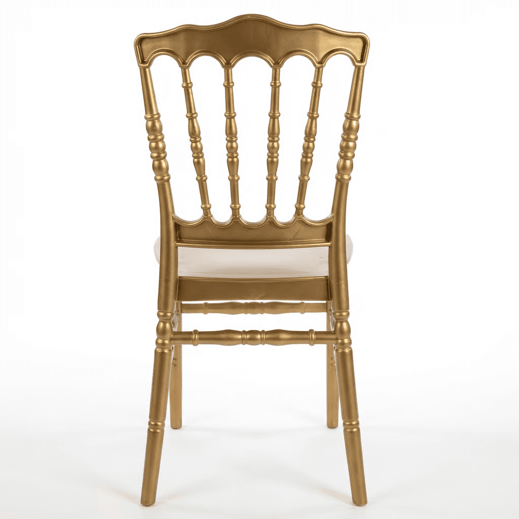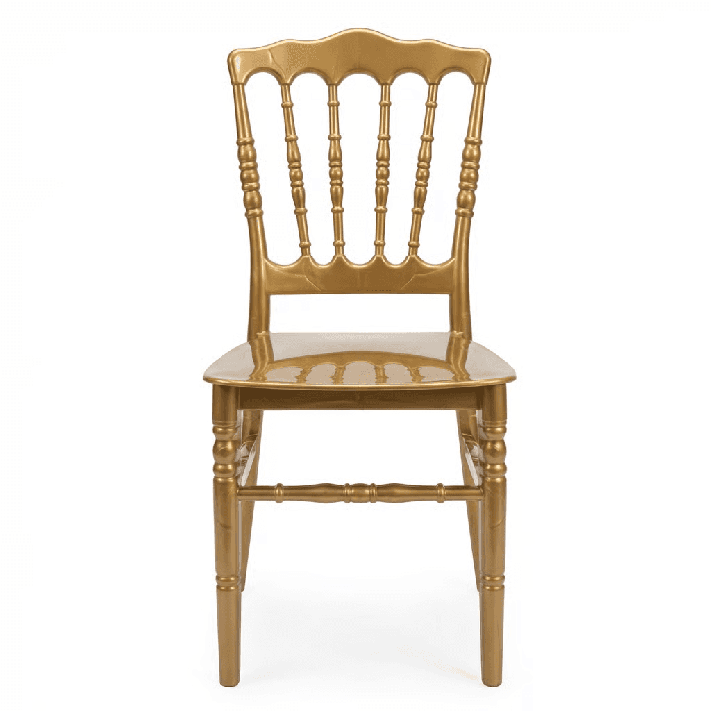 Silla VERSALLES de Econosillas, fabricada en polipropileno monobloque con protección UV, apta para uso en exteriores con peso sugerido de 150 kg. Disponible en blanco, perla, plata, negro, chocolate y oro, adecuada para banquetes, terrazas y espacios donde se busca apariencia elegante y alta resistencia.