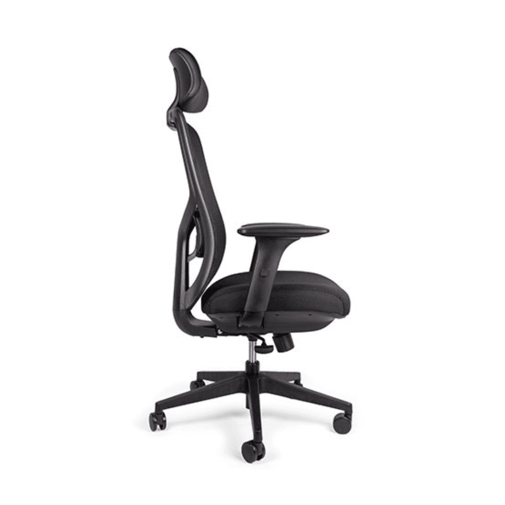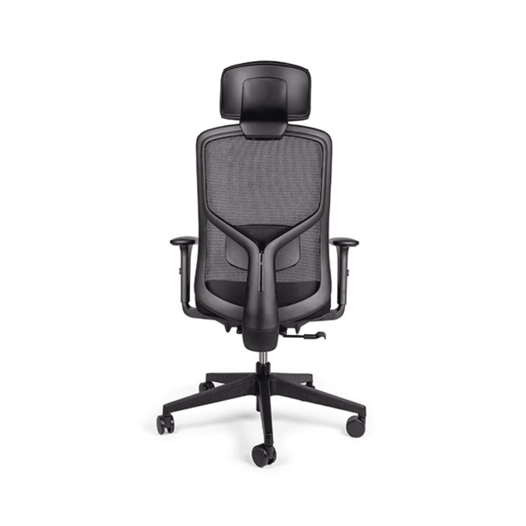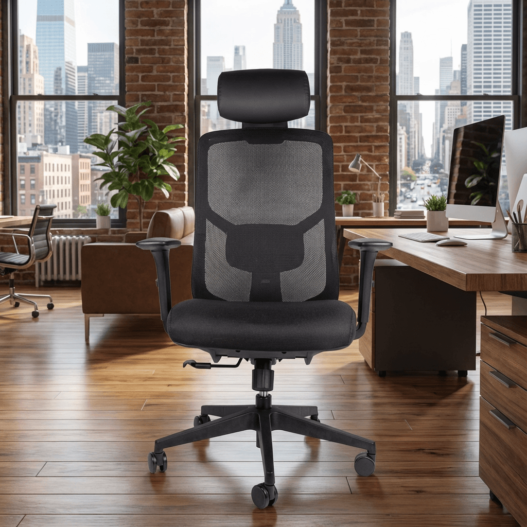 Silla ejecutiva ergonómica de oficina con respaldo de malla ventilada, soporte lumbar ajustable, asiento acolchonado y mecanismo synchro con bloqueo, diseñada para confort en jornadas largas.