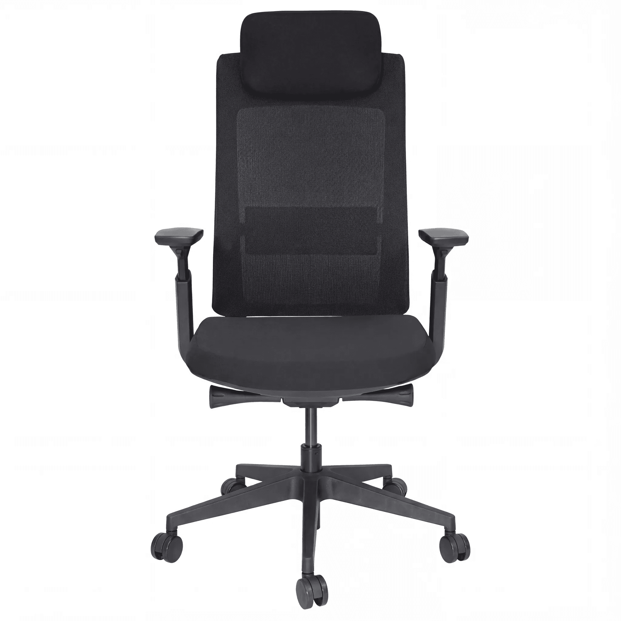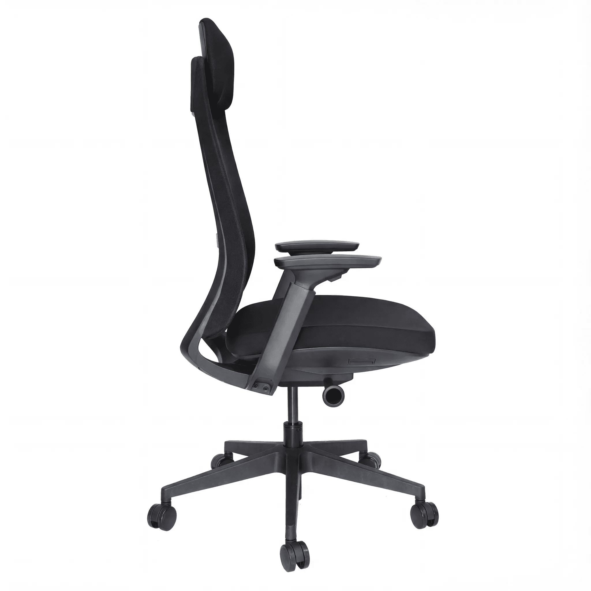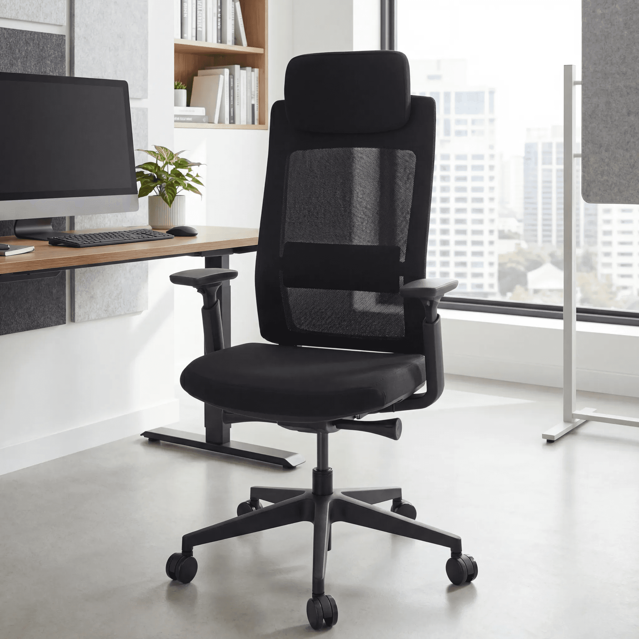 Silla ejecutiva con respaldo de malla ergonómica y asiento acolchonado, equipada con mecanismo articulado y pistón ajustable de altura, diseñada para uso diario en oficina o espacios de trabajo profesionales.
