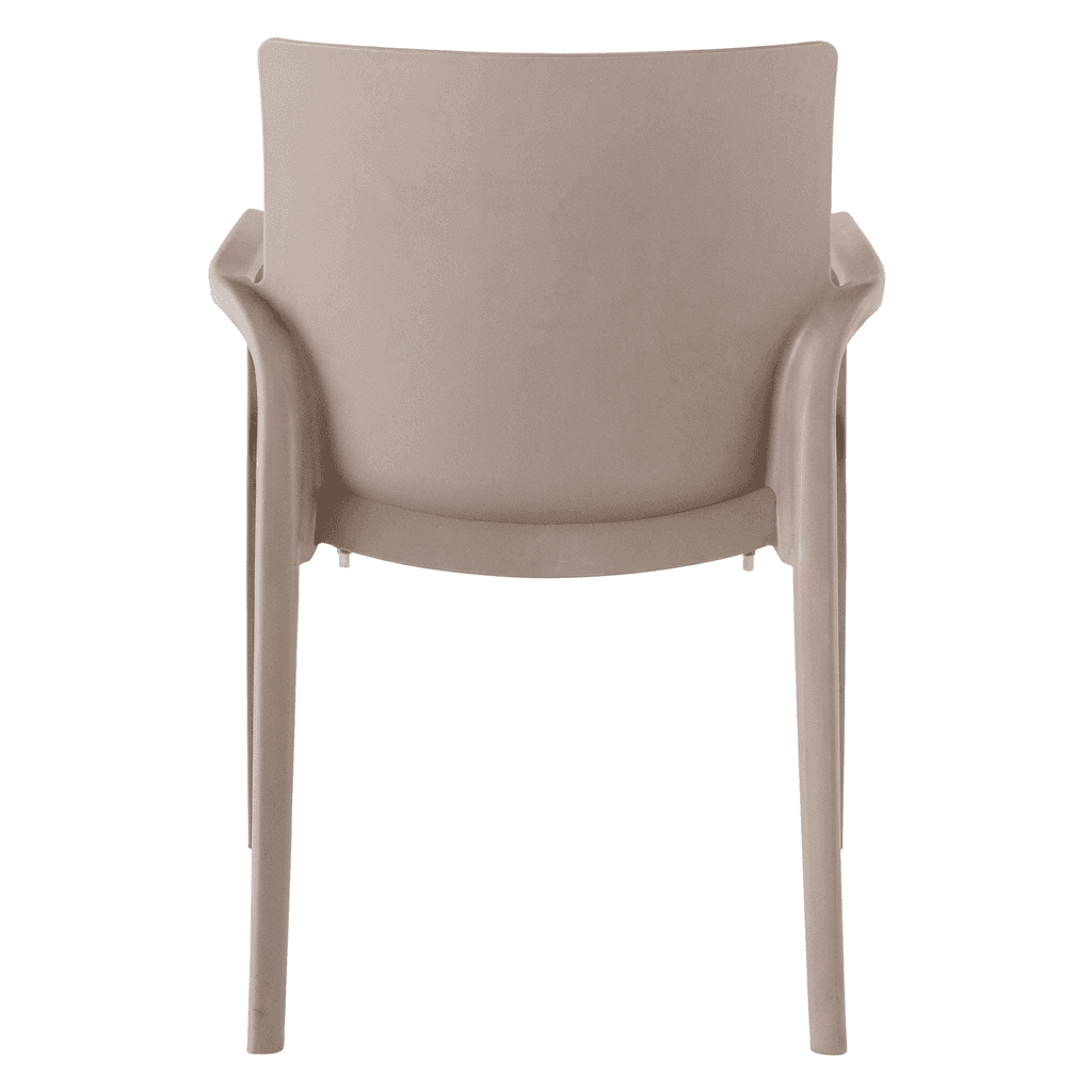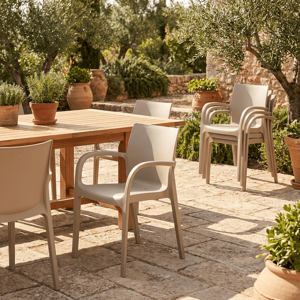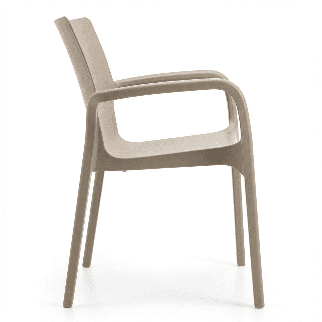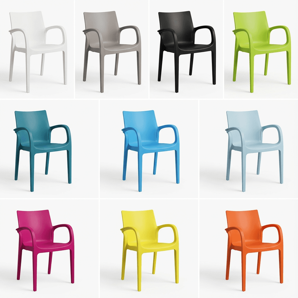 Silla de exterior de la línea Alissa con estructura integral en polipropileno, diseñada para soportar intemperie y ambiente salino, con peso sugerido de 130 kg. Su diseño envolvente con brazos integrados y variedad de colores la hace adecuada para terrazas, restaurantes, albercas y espacios residenciales modernos.