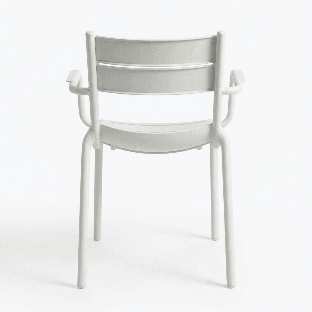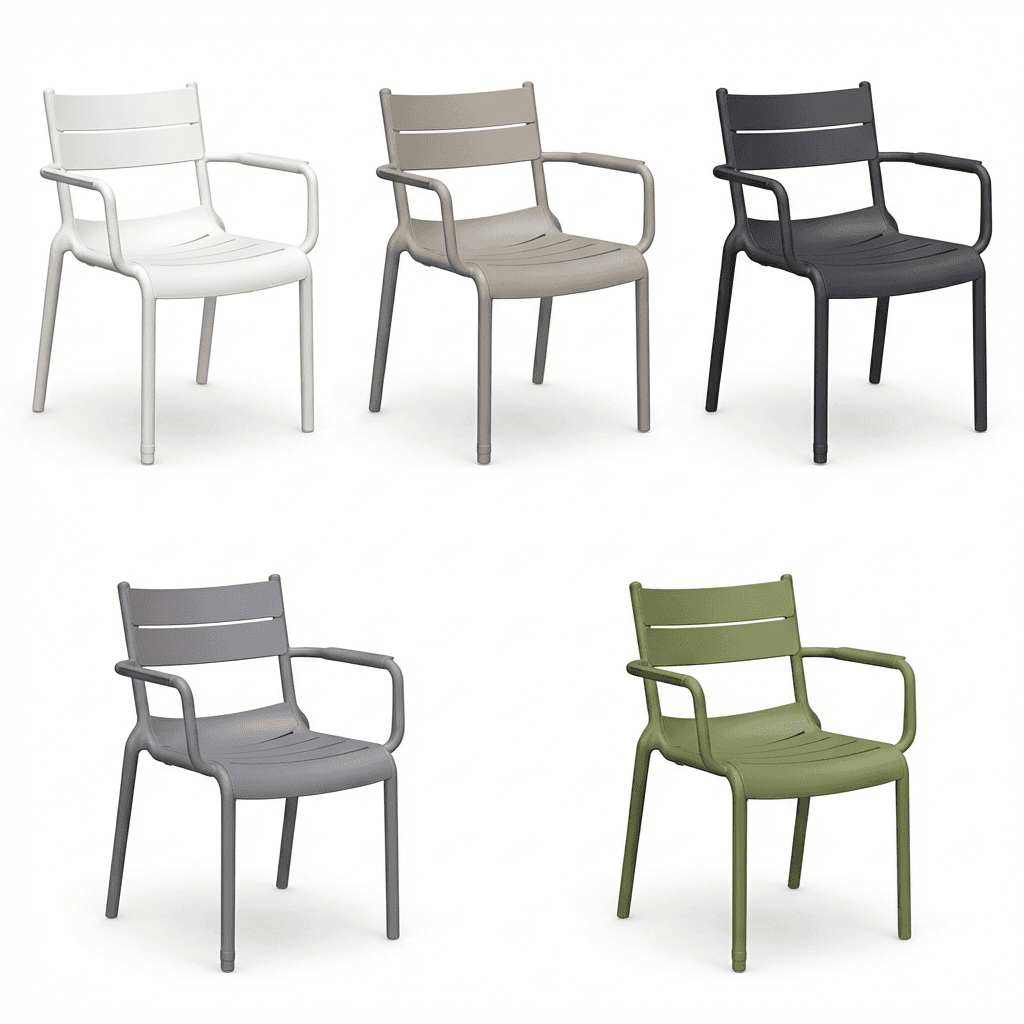 Silla para exterior Naples OHV-7220A de cuerpo monobloque en polipropileno con protección UV, adecuada para ambientes salinos y con peso sugerido de 130 kg. Sus colores (blanco, gris, gris oscuro, gris acero y verde agave) la vuelven una opción versátil para terrazas, restaurantes, jardines y áreas públicas.