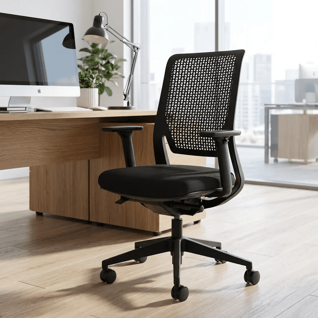 Silla ejecutiva con mecanismo italiano Donati, respaldo ventilado y asiento de alta densidad para uso intensivo.