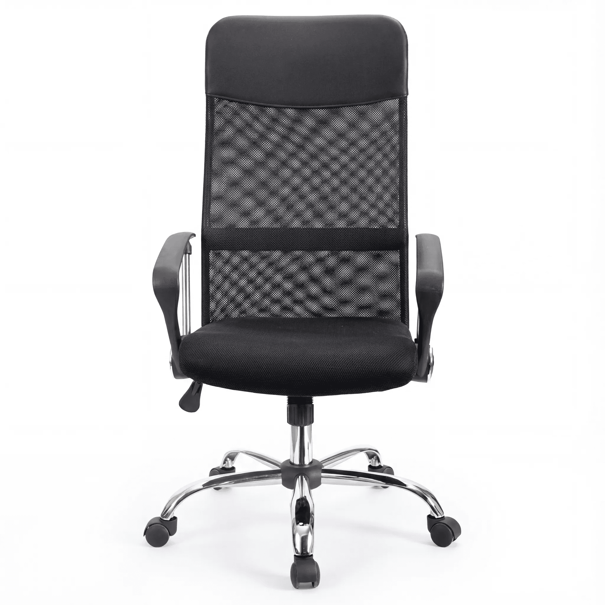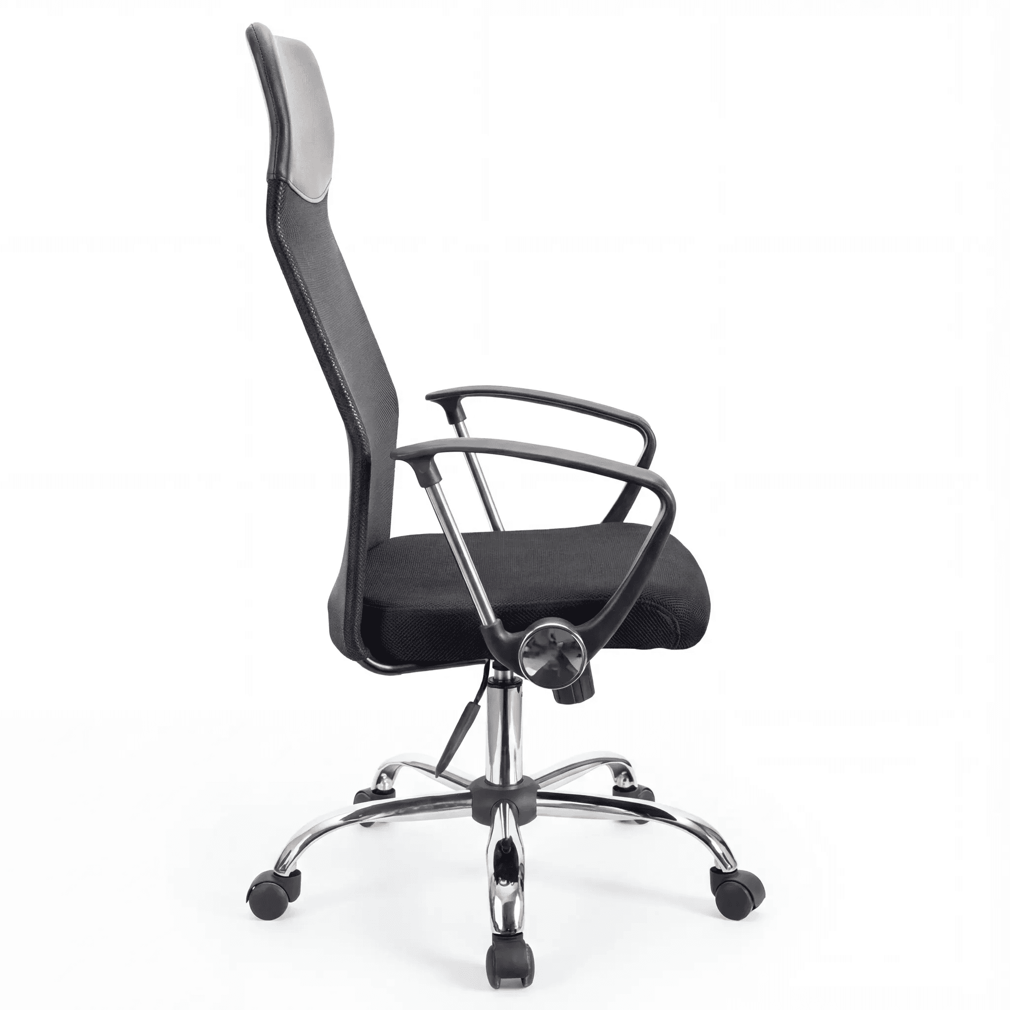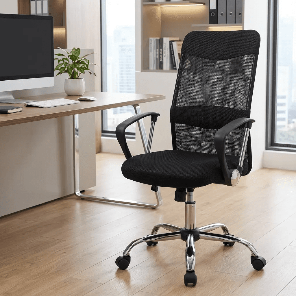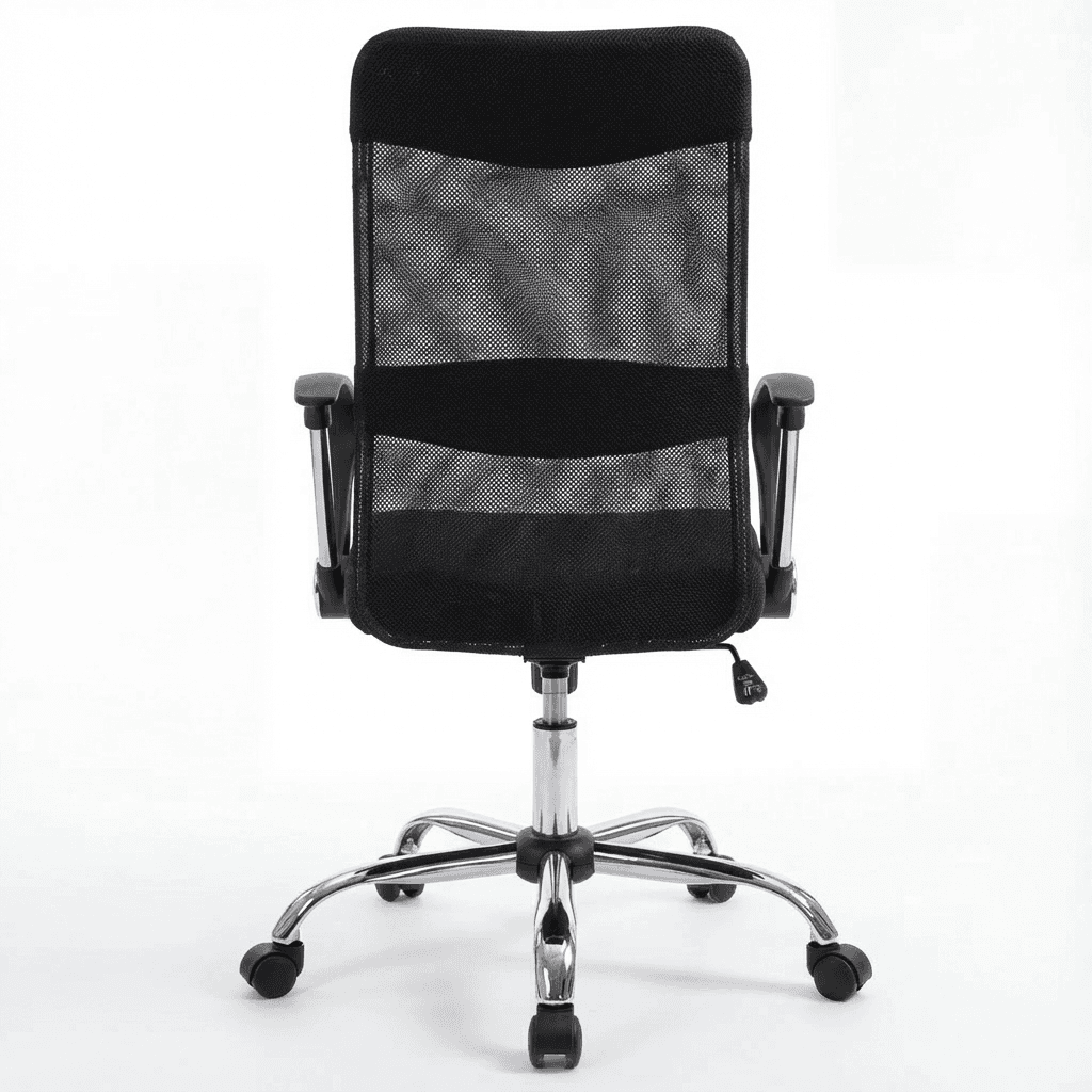Silla operativa con respaldo alto en malla ergonómica, asiento acolchonado con espuma de alta resiliencia, brazos semi-rígidos y mecanismo reclinable con bloqueo. Ideal para oficinas y espacios de trabajo con diseño funcional.
