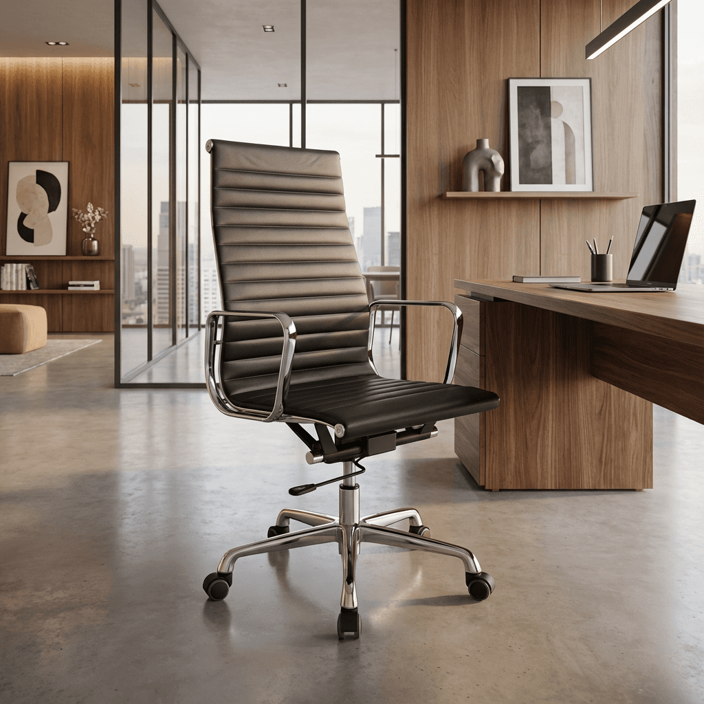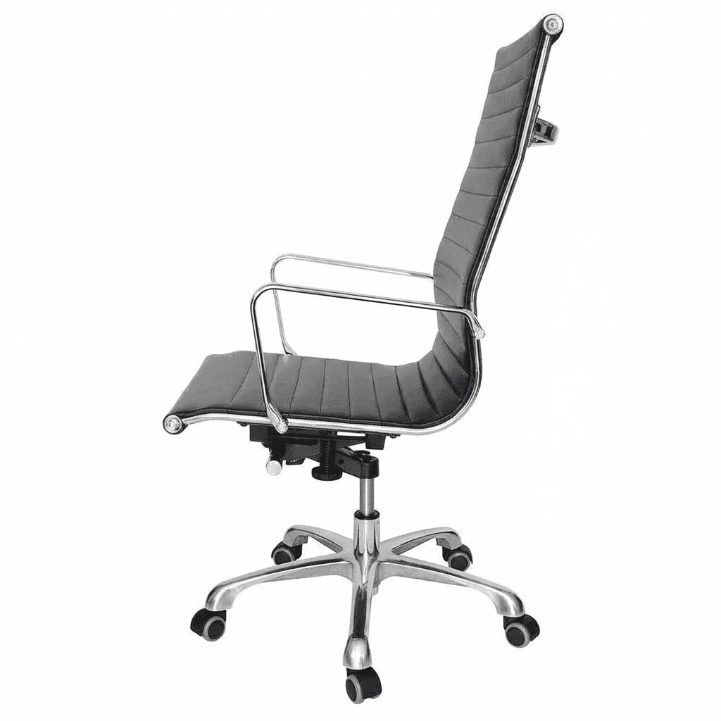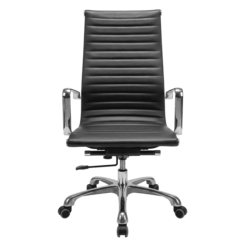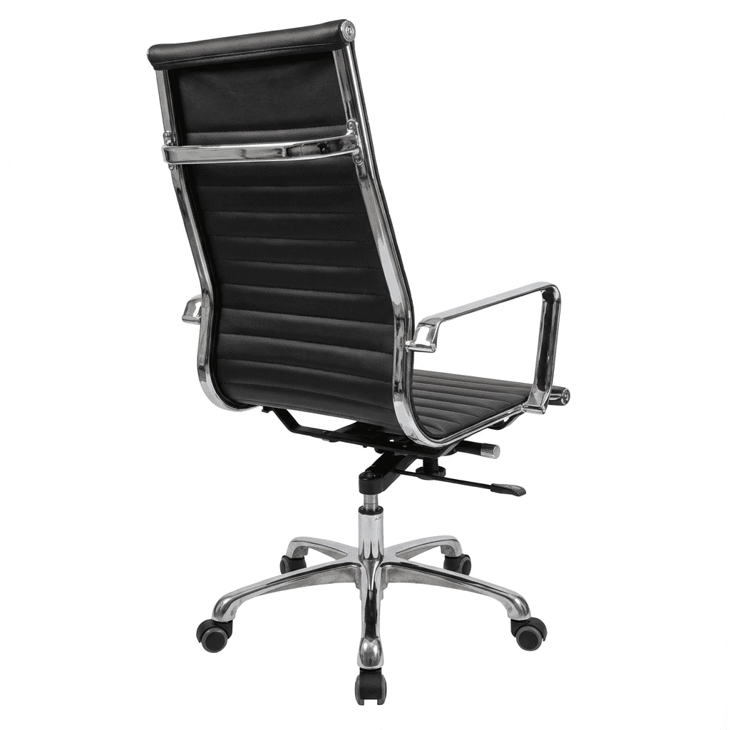 Silla ejecutiva de dirección con respaldo alto, tapizado en soft revolving leather negro y mecanismo ergonómico tipo knee-tilt con ajuste de altura y reclinación, ideal para oficinas, despachos y espacios profesionales.