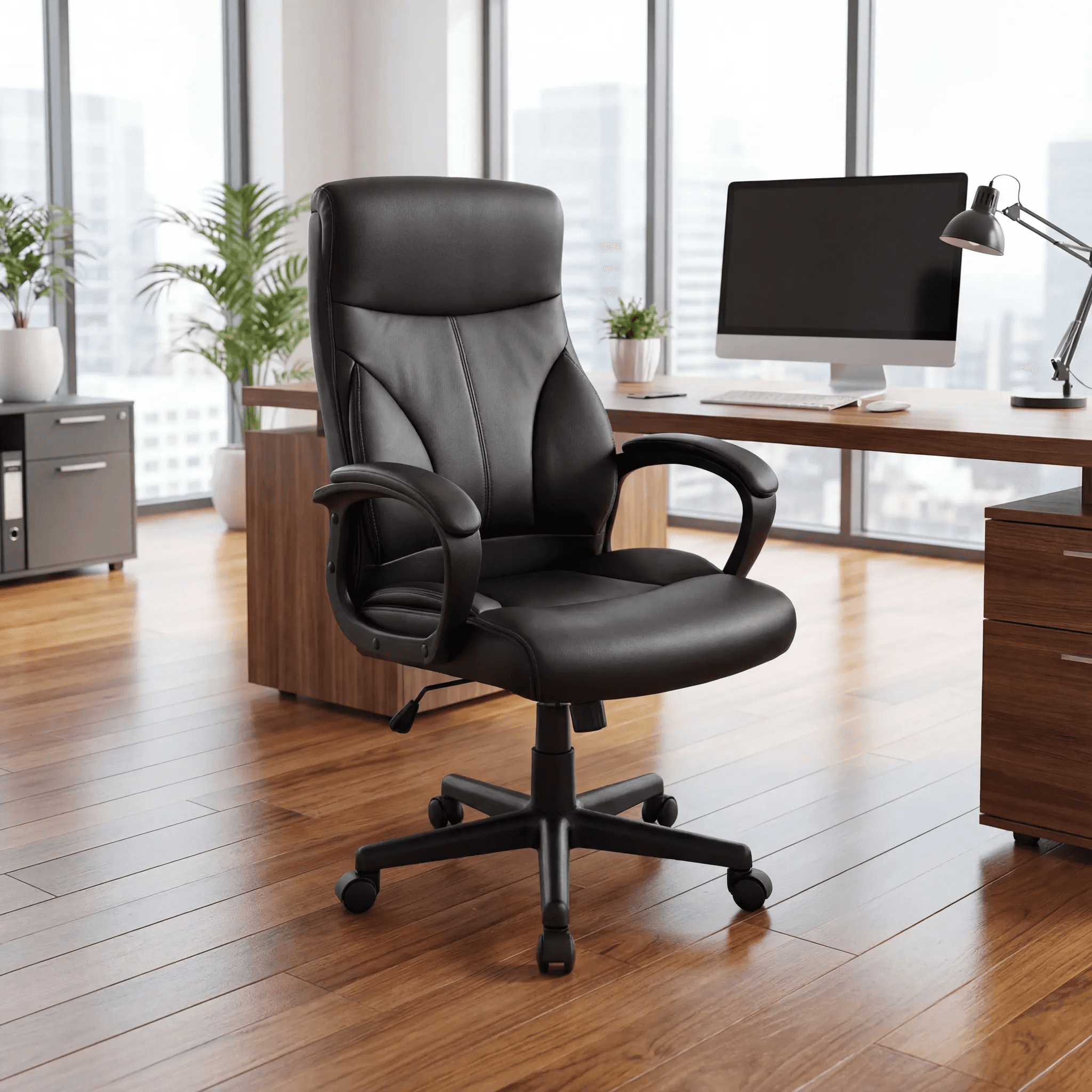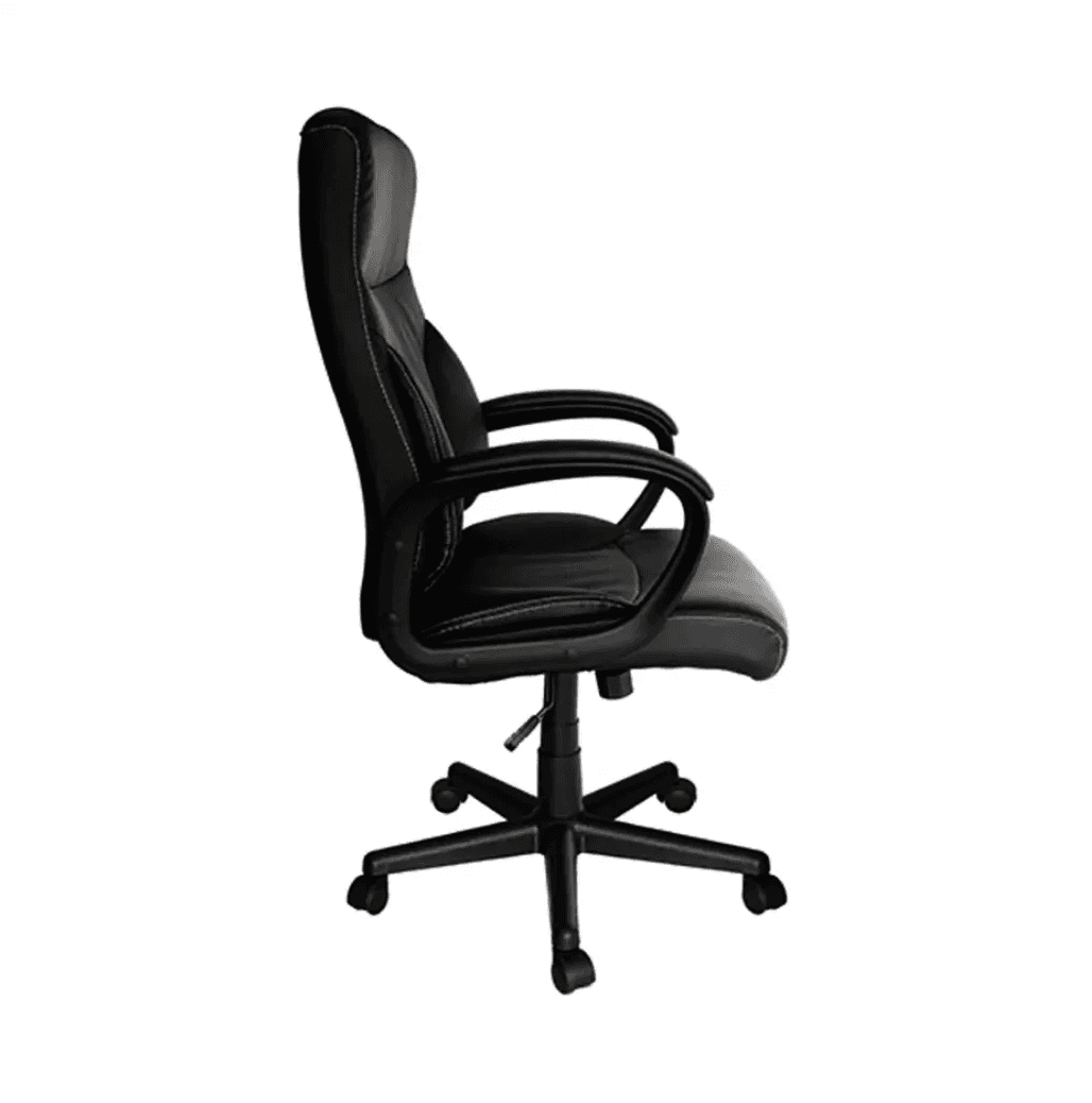 Silla de oficina con respaldo alto y diseño ergonómico, asiento y respaldo acolchonados, mecanismo reclinable y ajuste de altura. Ideal para ambientes de trabajo con uso ligero o corporativo.
