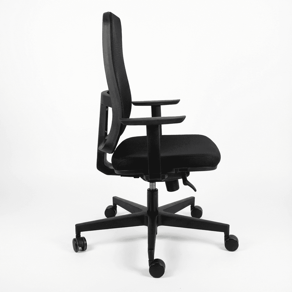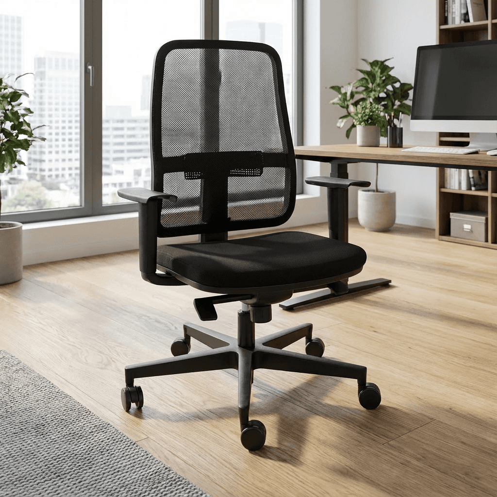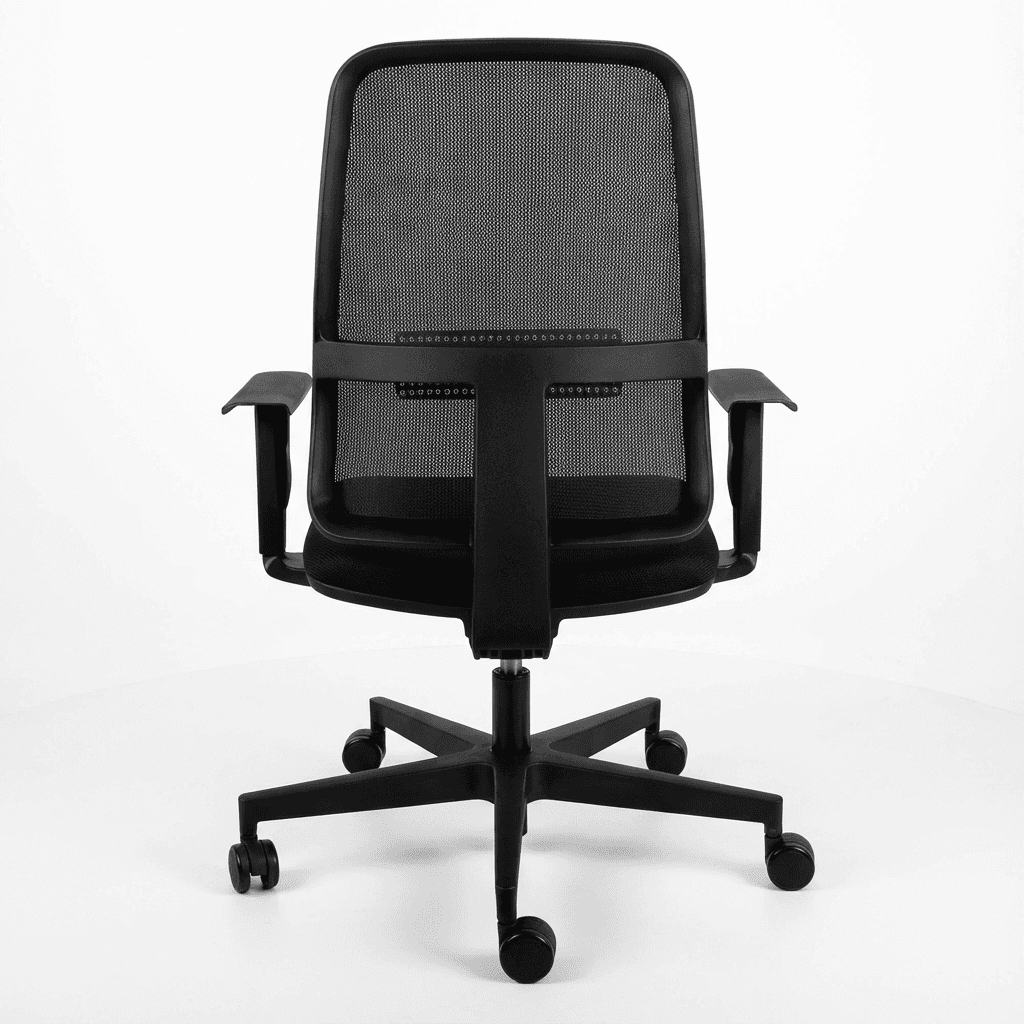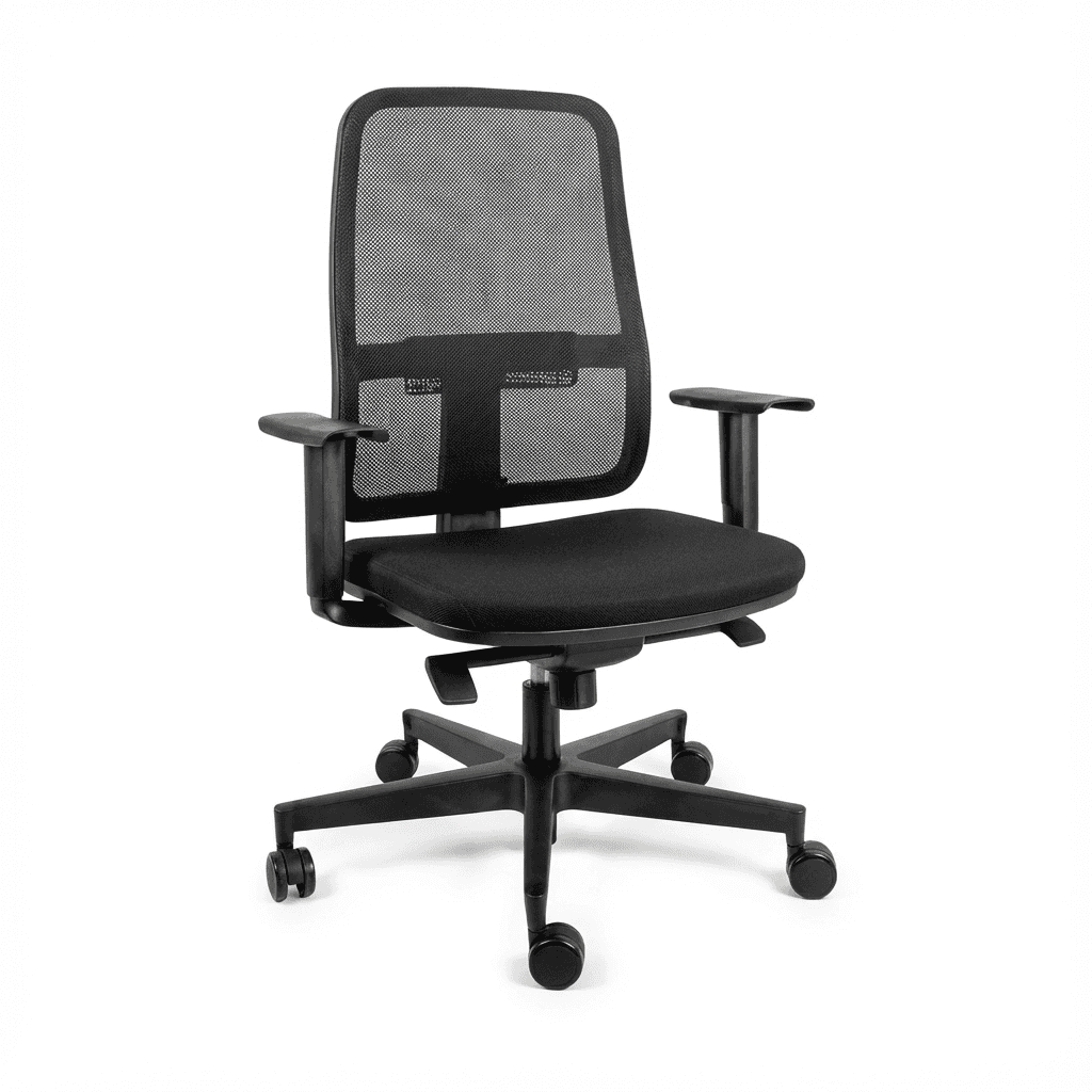 Sillón operativo con respaldo en malla y asiento tapizado, estructura y base de poliamida en color azul profundo. Diseñado para oficina con estilo ergonómico.