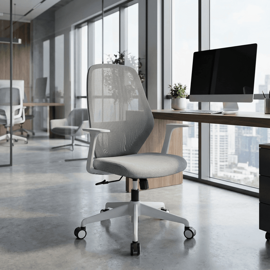 Silla Flash OHE-98 de diseño ergonómico con respaldo en malla y asiento acolchonado, altura ajustable y mecanismo reclinable. Pensada para oficina, home office o espacios de trabajo con uso frecuente. Disponible en GRIS y NEGRO.