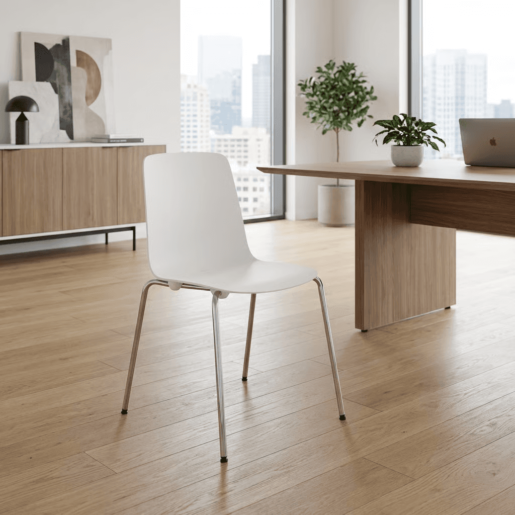 VESPER 1, con casco de polipropileno con fibra de vidrio y patas de acero, es una silla de diseño moderno, apta para contextos públicos (como bares y restaurantes) y residenciales.