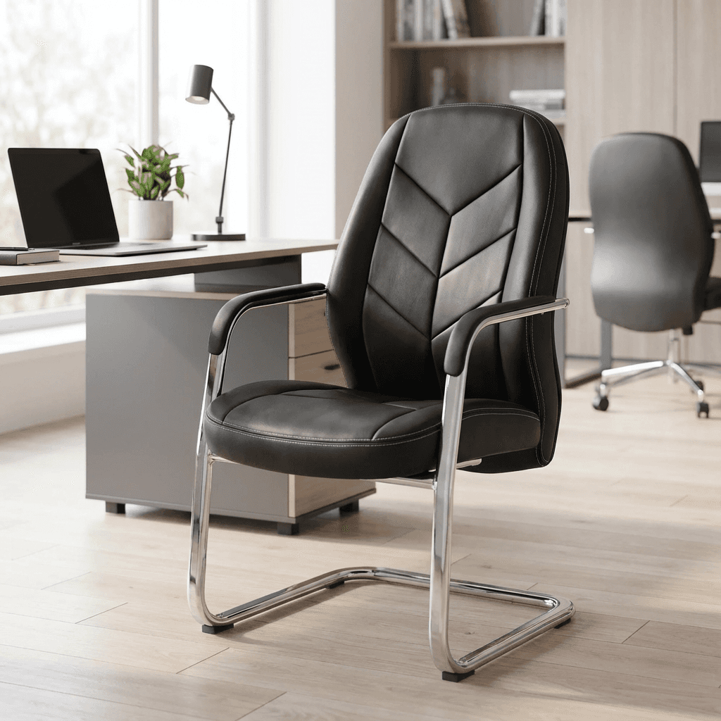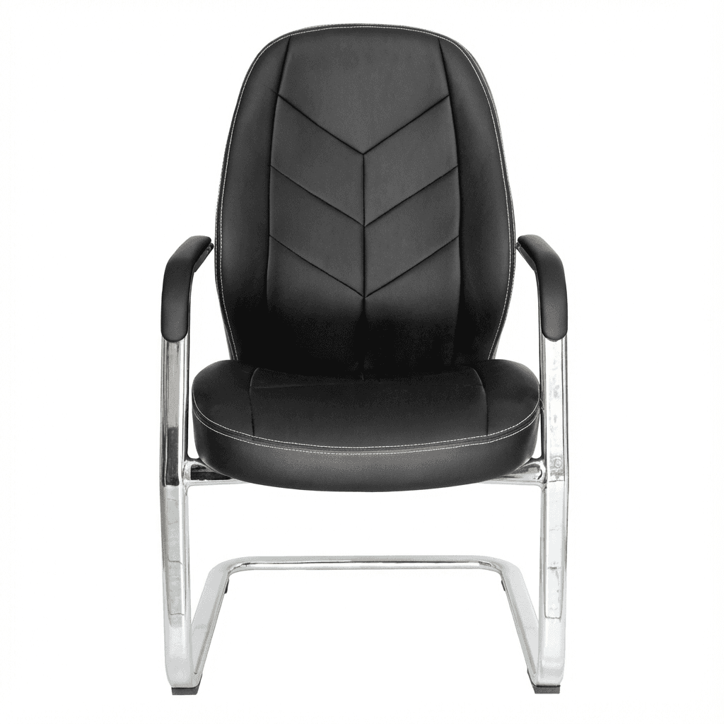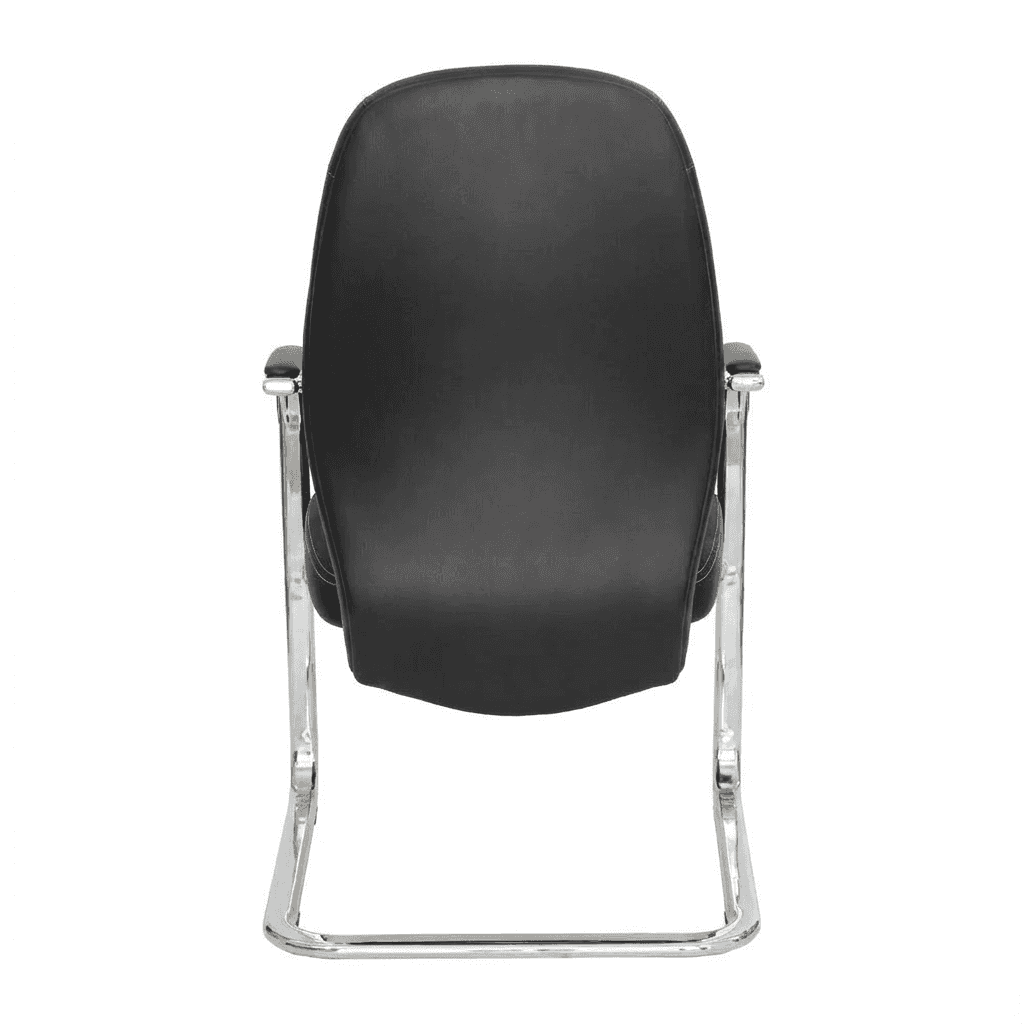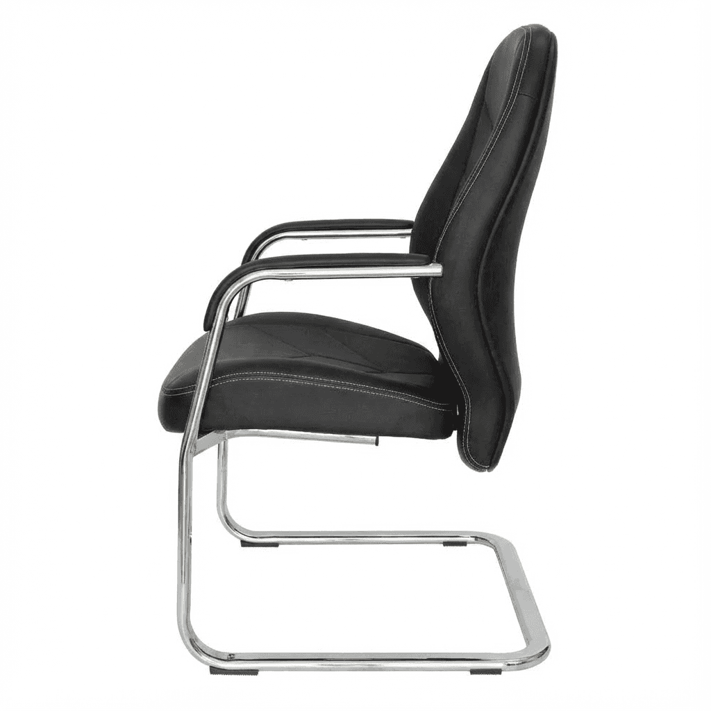Silla de visita con respaldo bajo y asiento acolchados, base tipo trineo cromada y tapizado de cuero sintético. Ideal para espacios de recepción, consultorios o salas de espera.