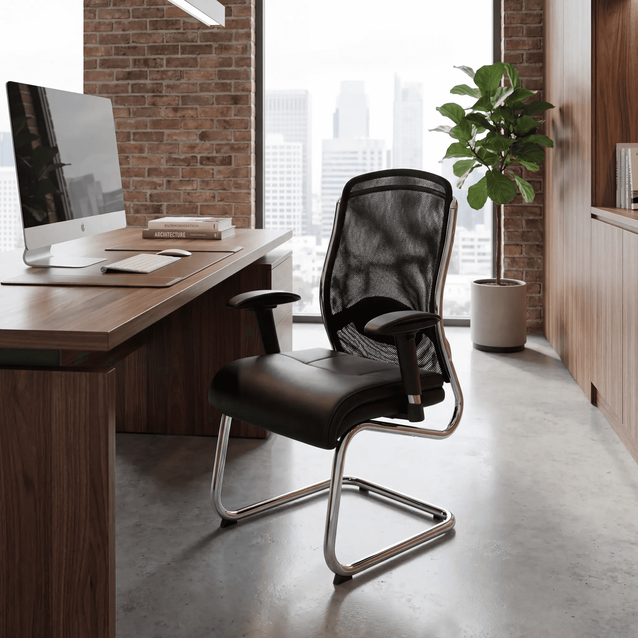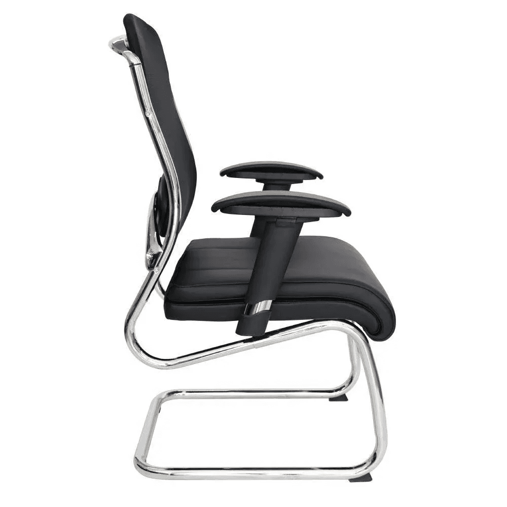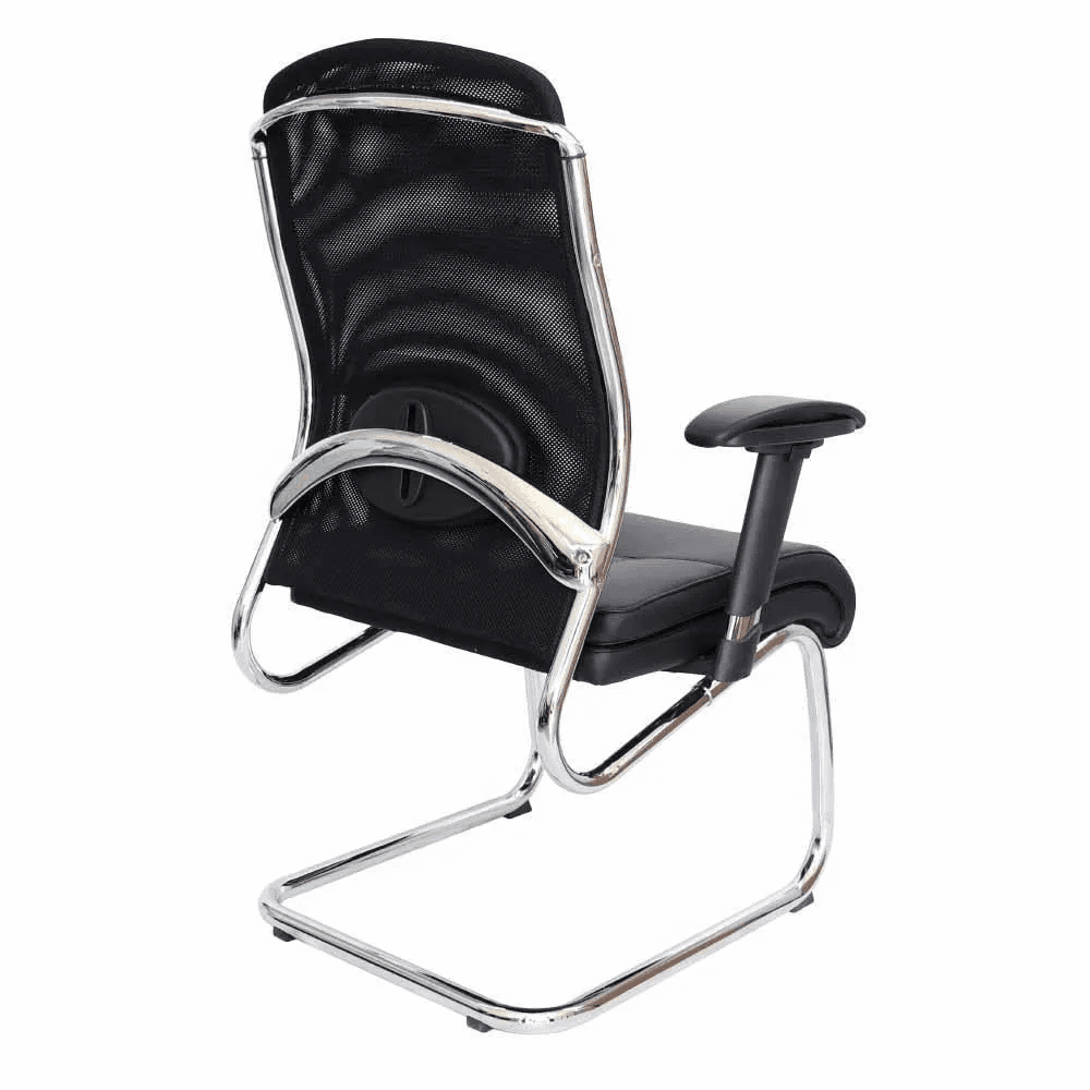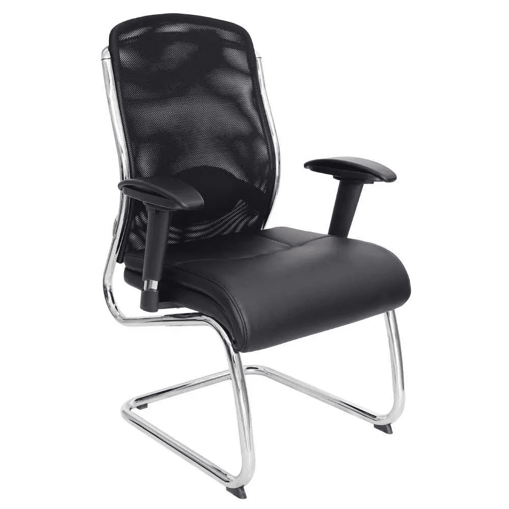 Silla de visita de diseño ejecutivo con estructura tipo trineo cromada, respaldo de malla negra y asiento acolchonado. Ideal para salas de juntas, espera o recepción corporativa.
