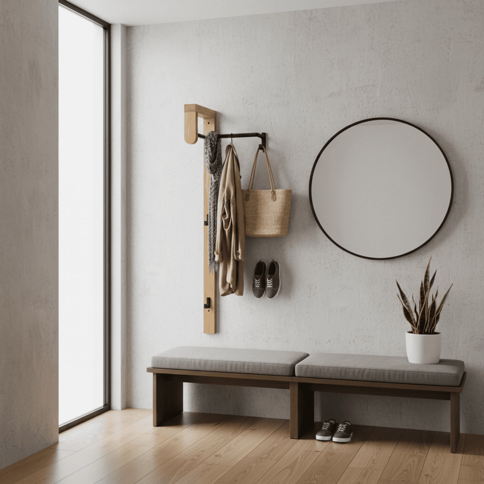 Es un perchero de diseño nórdico minimalista pensado para ahorrar espacio. Se monta directamente en la pared y combina una barra para perchas en la parte superior con dos ganchos adicionales debajo, ideales para bolsos o bufandas.